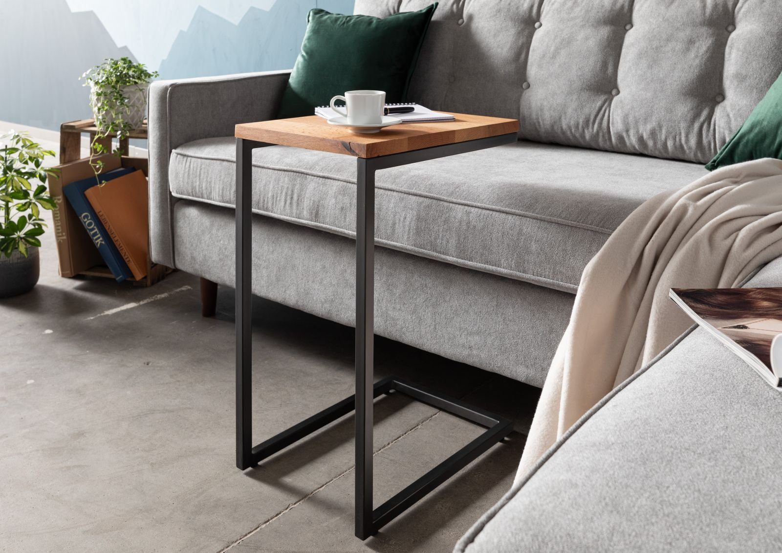 Dieser Beistelltisch aus Wildeiche und Stahl überzeugt mit seinem gelungenen und trendigen Materialmix. Gefertigt aus lebendig gemasertem Eichenholz und cleanem Metall entsteht ein spannungsreiches Design. Aber das ist nicht das Einzige, was diesen hohen Beistelltisch der LOUNGE Collection auszeichnet. Der Tisch verfügt über ein einseitig geöffnetes Gestell, sodass er sich an dieser Aussparung nahe an das Sofa schieben lässt. Fernbedienung und Getränke rücken so sprichwörtlich in greifbare Nähe.