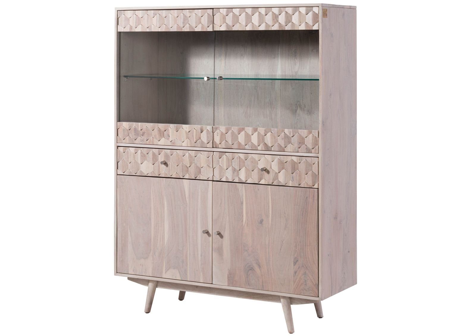 Dieses Highboard vereint mit 120 cm Breite und Glasfront praktische Eigenschaften mit einem edlen Äußeren. Gefertigt aus vollmassiver Akazie, zeigt sich das Schränkchen im 60er Jahre-Look: Geradlinige Formen, dezente Griffe und die typischen Füße sprechen optisch die Sprache des Jahrzehnts. Der Blick bleibt insbesondere an der Wabenstruktur hängen, welche die Glastüren im oberen Teil sowie die Schubladenfronten ziert. Eine Doppeltüre mit 4 Fächern stellt im unteren Bereich zusätzlich Stauraum bereit.