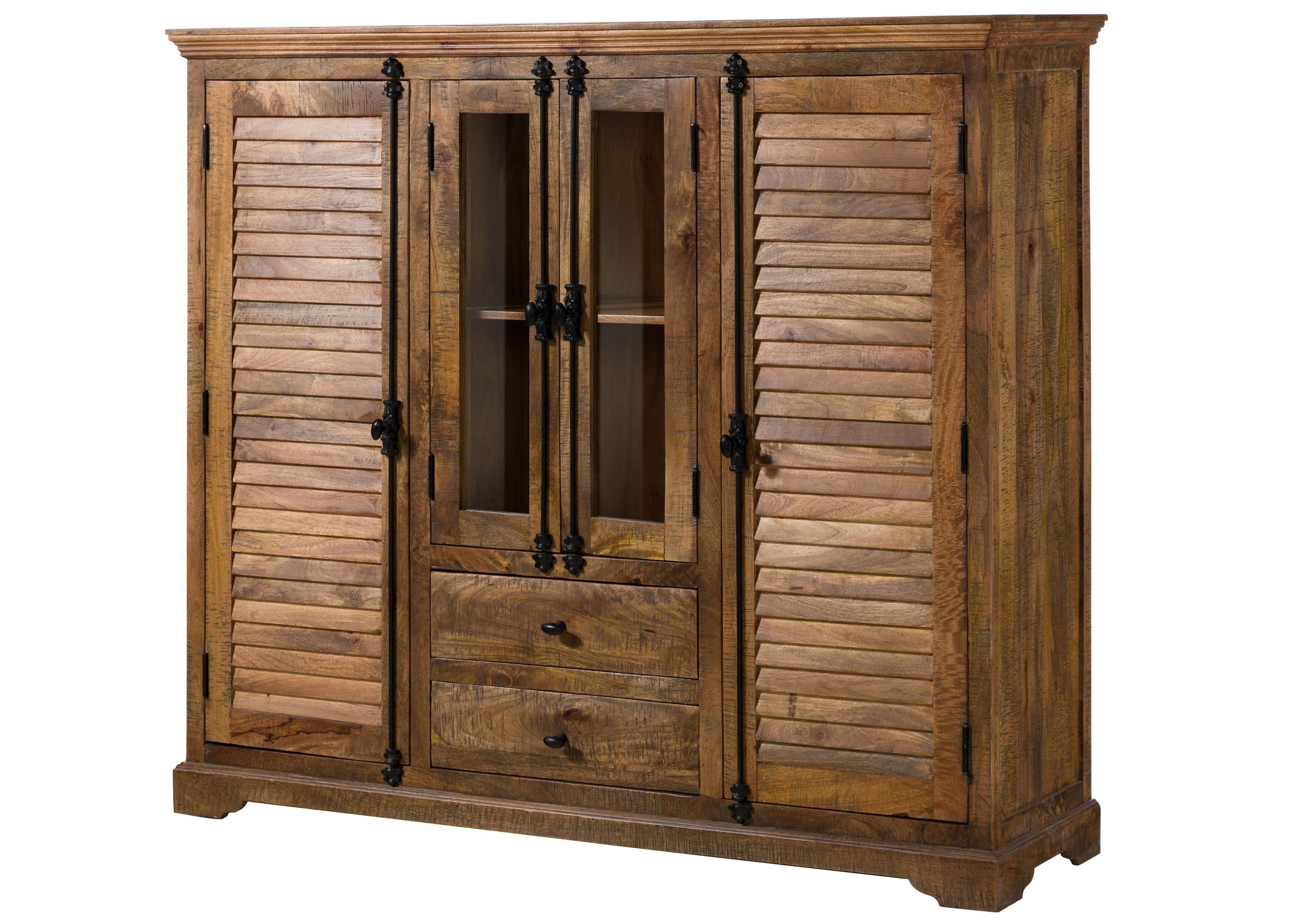 Landhausstil muss nicht immer weiß sein: Das beweist dieses Highboard aus Mango Massivholz in Braun eindrucksvoll. Die dunkle Lackierung erzeugt eine rustikale Optik. Und auch die durchschimmernden Holzeigenschaften unterstreichen den Look. Durchzogen von eindrucksvollen Astlöchern in verschiedenen Braunabstufungen sowie mit einem groben Hobelschlag bearbeitet steht dieses Möbel für ländlich inspiriertes Wohnen. Das Landhaus-Momentum à la française unterstreichen die Lamellen links und rechts.