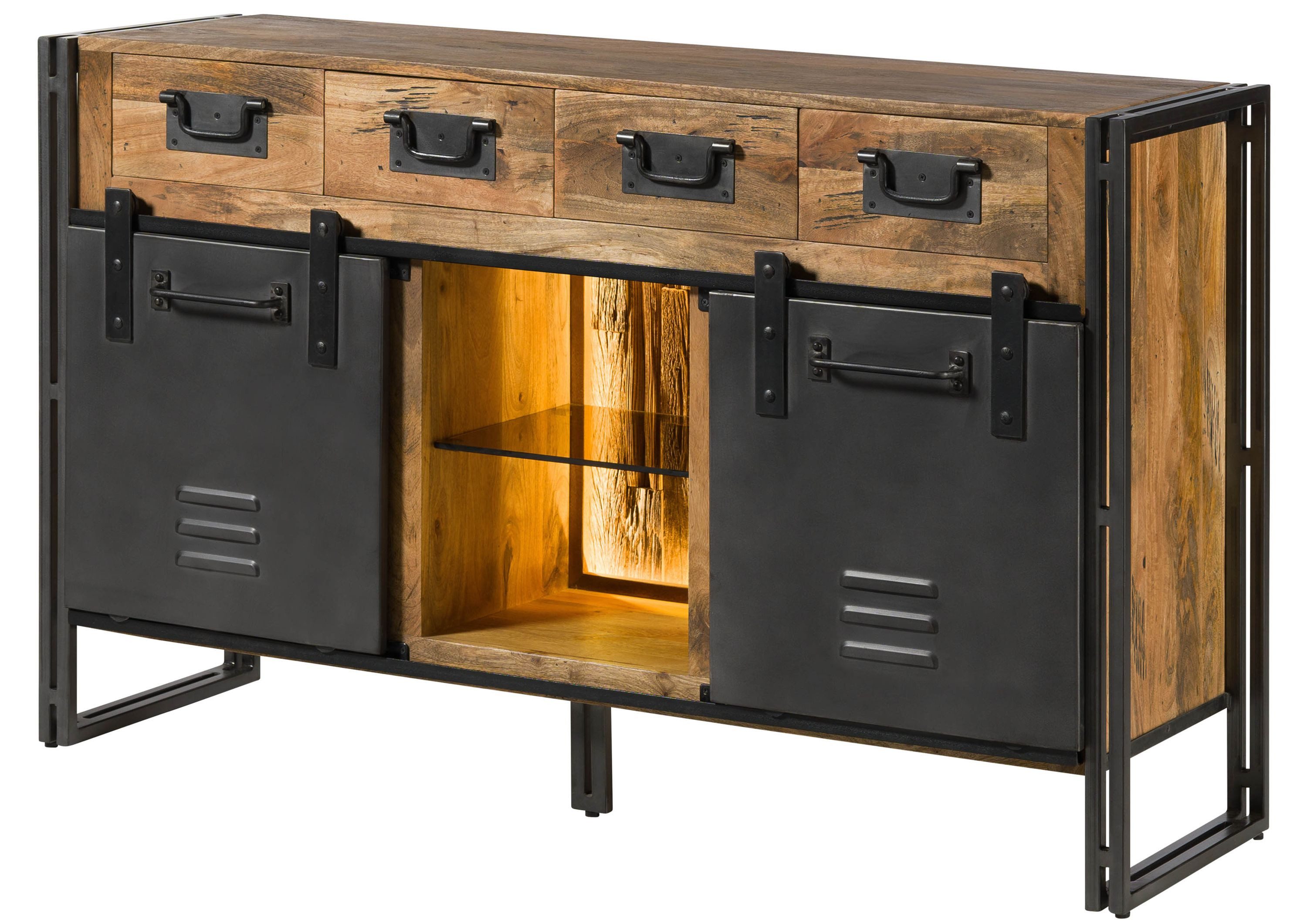 Industrial Design mit Wow-Momenten: Dieses Sideboard aus massivem Mangoholz bringt dank einer integrierten LED-Beleuchtung eine warme Stimmung in den Raum. Gleichzeitig setzt das Licht eine strukturierte Rückwand aus Altholz perfekt in Szene. Für das industrielle Flair sorgen Schiebetüren in Spind-Optik, klappbare Bügelgriffe und die sichtbare Schienen-Konstruktion. Der trendige Used Look der Mangoholz-Oberflächen – kreiert durch sichtbare Hobelschläge – ergänzt das Gesamtbild auf den Punkt.