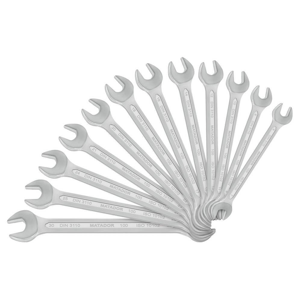 Doppelmaulschlüssel-Satz, 12-tlg., DIN 3110, Inhalt: 6 x 7 - 8 x 9 - 10 x 11 - 12 x 13 - 14 x 15 - 16 x 17 - 18 x 19 - 20 x 22 - 21 x 23 - 24 x 27 - 25 x 28 - 30 x 32 mm. Praxiserprobte Zusammenstellungen von Doppelmaulschlüsseln. Drehmomentwerte weit über DIN für zusätzliche Sicherheit. Drehmomentwerte deutlich über DIN. Alle wichtigen Größen in einem Satz. Satz in praktischer, transparenter PolypropylenBox: Stabile Verpackung, stapel- und lagerbar, wiederverschließbar, mehrfach verwendbar und mit Aufhängeloch für Werkzeugpanele (nur 0100 9080). Chrom Vanadium-Stahl / Matt verchromt. DIN 3110 / ISO 3318 / 1085 / 10102..