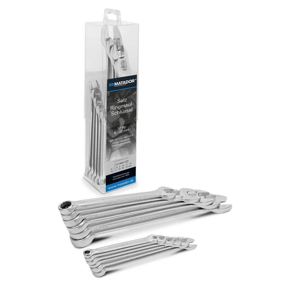 Satz Ringmaulschlüssel, 12-tlg., abgewinkelt, metrisch. Inhalt: 6 - 7 - 8 - 9 - 10 - 11 - 13 - 14 - 17 - 19 - 20 - 22. Ideal für Sechskantverschraubungen und bei im Weg stehenden Bolzen und Kabel. Mit abgewinkelter Ringseite. Universell einsetzbar zum Betätigen und Gegenhalten von Schraubverbindungen. Hochwertige, langlebige Industriequalität. Flache Köpfe für enge Platzverhältnisse. Angenehme Griffigkeit, durch matt verchromte Oberfläche, auch bei öligen Händen. Köpfe vollautomatisch geschliffen, für längere Lebensdauer von Schraube und Schlüssel. Maulstellung 15° abgewinkelt. Praxiserprobte Zusammenstellung von abgewinkelten Ringmaulschlüsseln. Alle wichtigen Größen in einem Satz. Verpackung, stapel- und lagerbar, wiederverschließbar, mehrfach verwendbar.