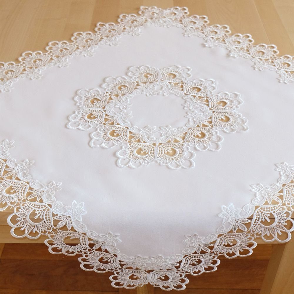 ELEGANTE TISCHDEKO – Tischdecke INES in 85 x 85 cm mit aufwendiger Spitzenbordüre im Vintage-Stil – ein stilvoller Akzent für klassische Wohnräume, Kommoden & gedeckte Tafeln.