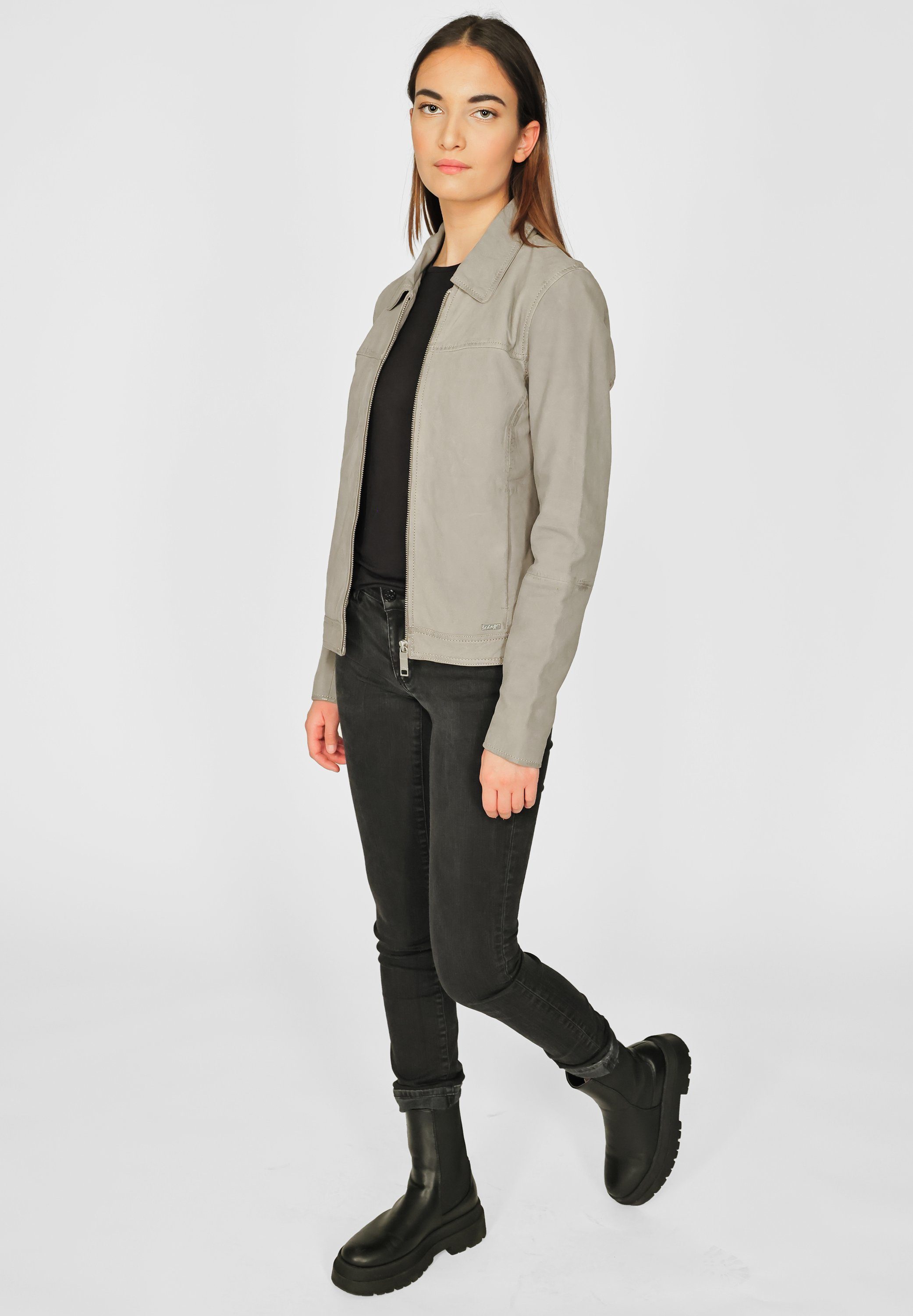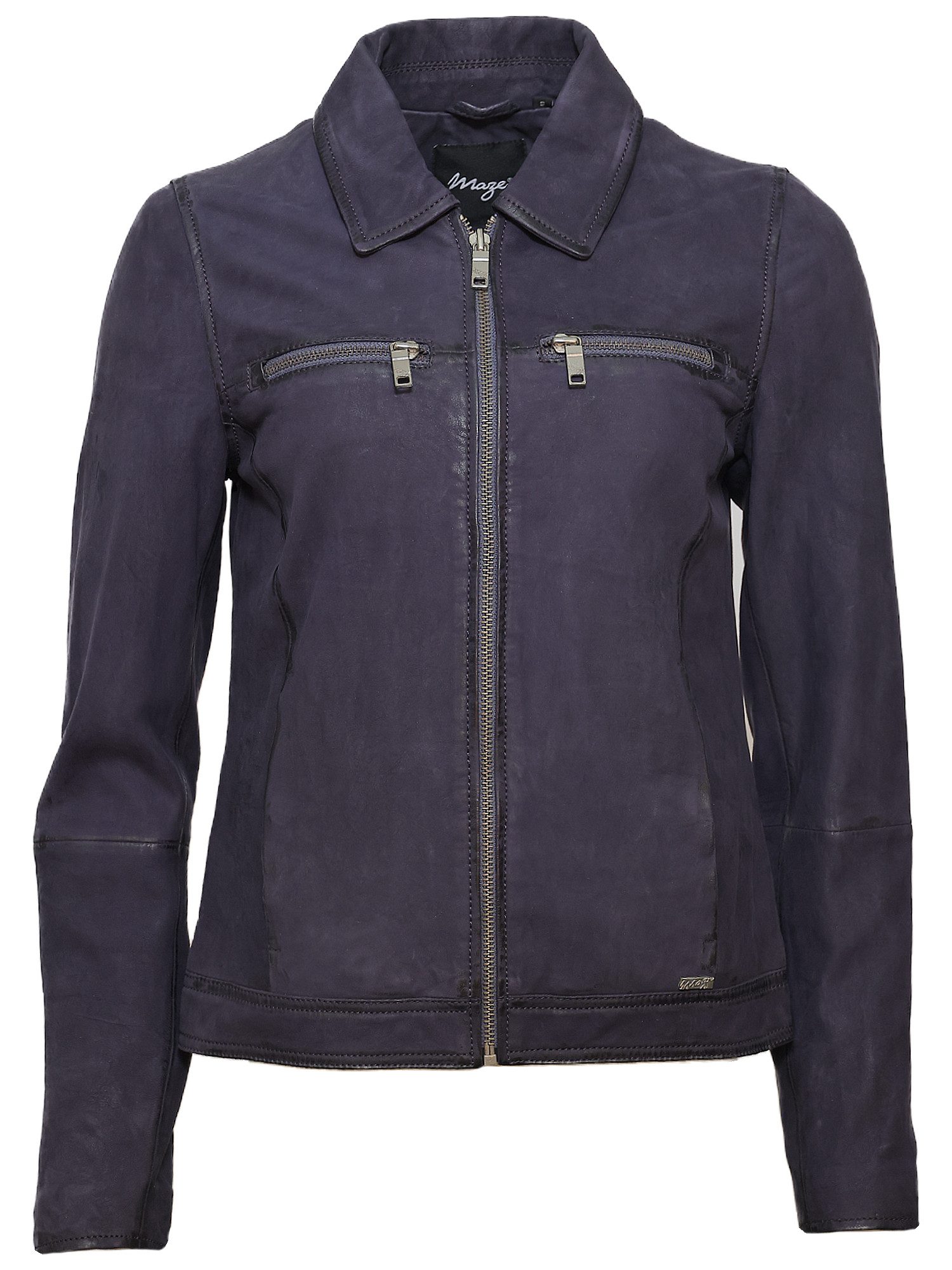 Elegante Lederjacke der Modemarke MAZE. Die Jacke verfügt über einen geraden Reißverschluss mit Hemdkragen. Zusätzlich ist die Jacke mit zwei Seitentaschen mit Druckknopf und einer Innentasche ausgestattet.