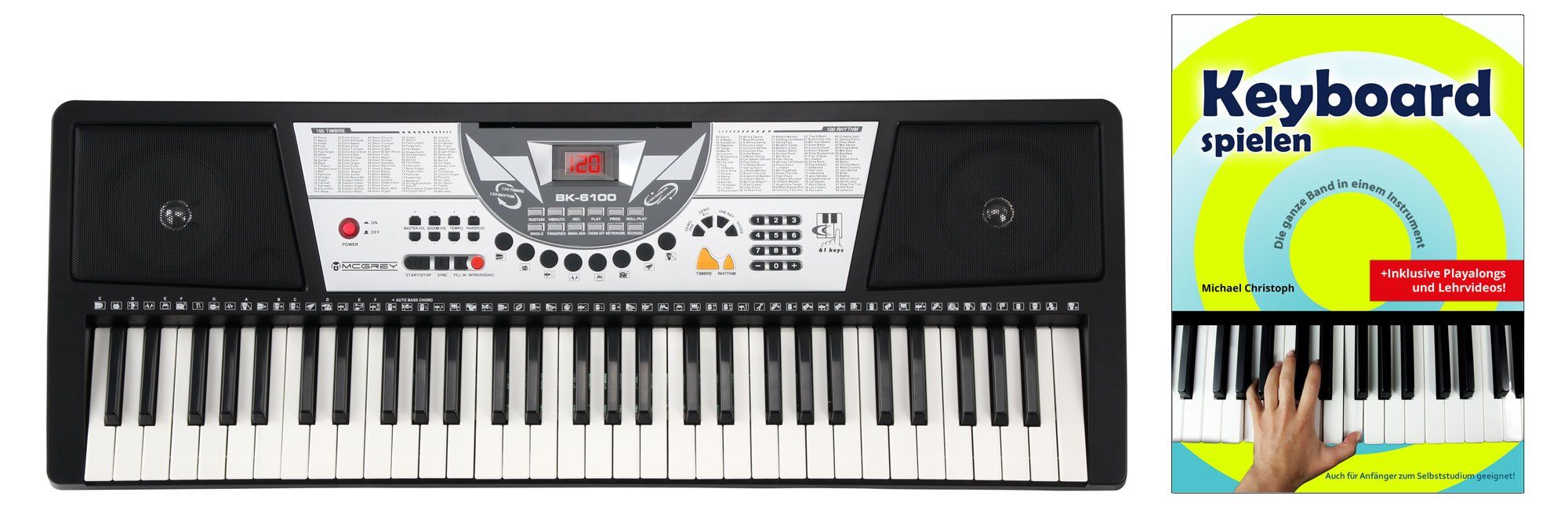 | Lieferumfang | 1 x McGrey BK-6100 Keyboard 1 x Netzteil 1 x Notenhalter 1 x Keyboardschule |