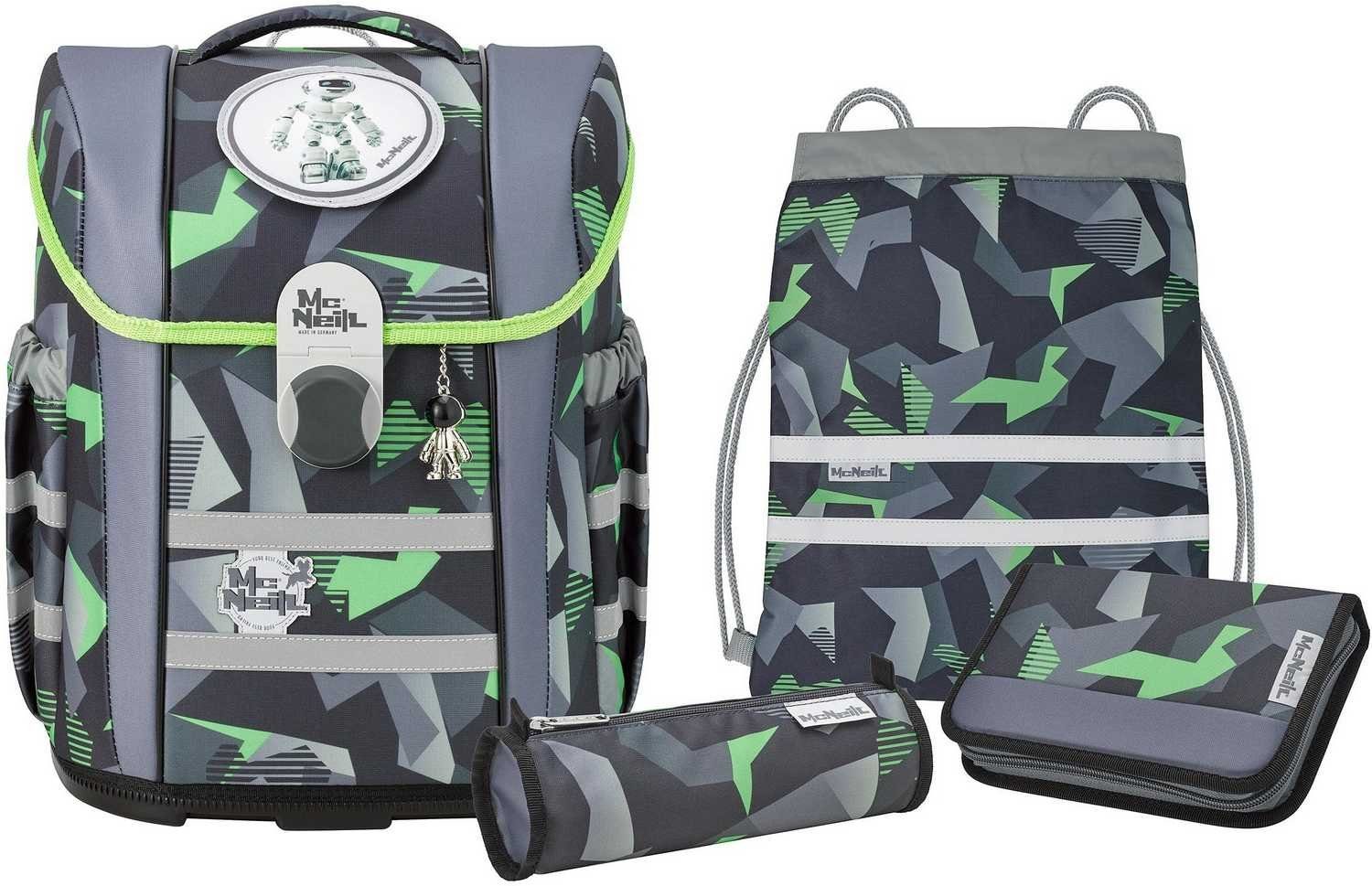 Ihr Kind kommt in die Schule und ist von eher zierlicher Statur? Dann ist der McNeill Mac2 TECHNO der perfekte Schulranzen für den künftigen Erstklässler. Denn mit einem Eigengewicht von nur knapp 1000 Gramm gehört der Mac2 TECHNO zu den leichtesten Schulranzen am Markt. Trotz des geringen Gewichts weiß der Ranzen mit einem Volumen von ca. 18 Litern zu überzeugen und bietet so mehr als genug Platz für die Schulsachen Ihres Kindes. In den beiden Seitentaschen, welche bequem mit einer Kordel verschlossen werden können, sind die Trinkflaschen super aufgehoben. Der höhenverstellbare Brustgurt und der abnehmbare Beckengurt sorgen für zusätzliche Entlastung der Schultern. Für einen sicheren Stand sorgt die stabile Bodenplatte und mit Hilfe des Magnetschlosses verschließt sich der Mac2 TECHNO fast von alleine. Und damit Ihr Kind auf dem Weg zur Schule im Straßenverkehr auch immer gut gesehen wird, verfügt der McNeill Mac2 TECHNO über zwei reflektierende Querstreifen.