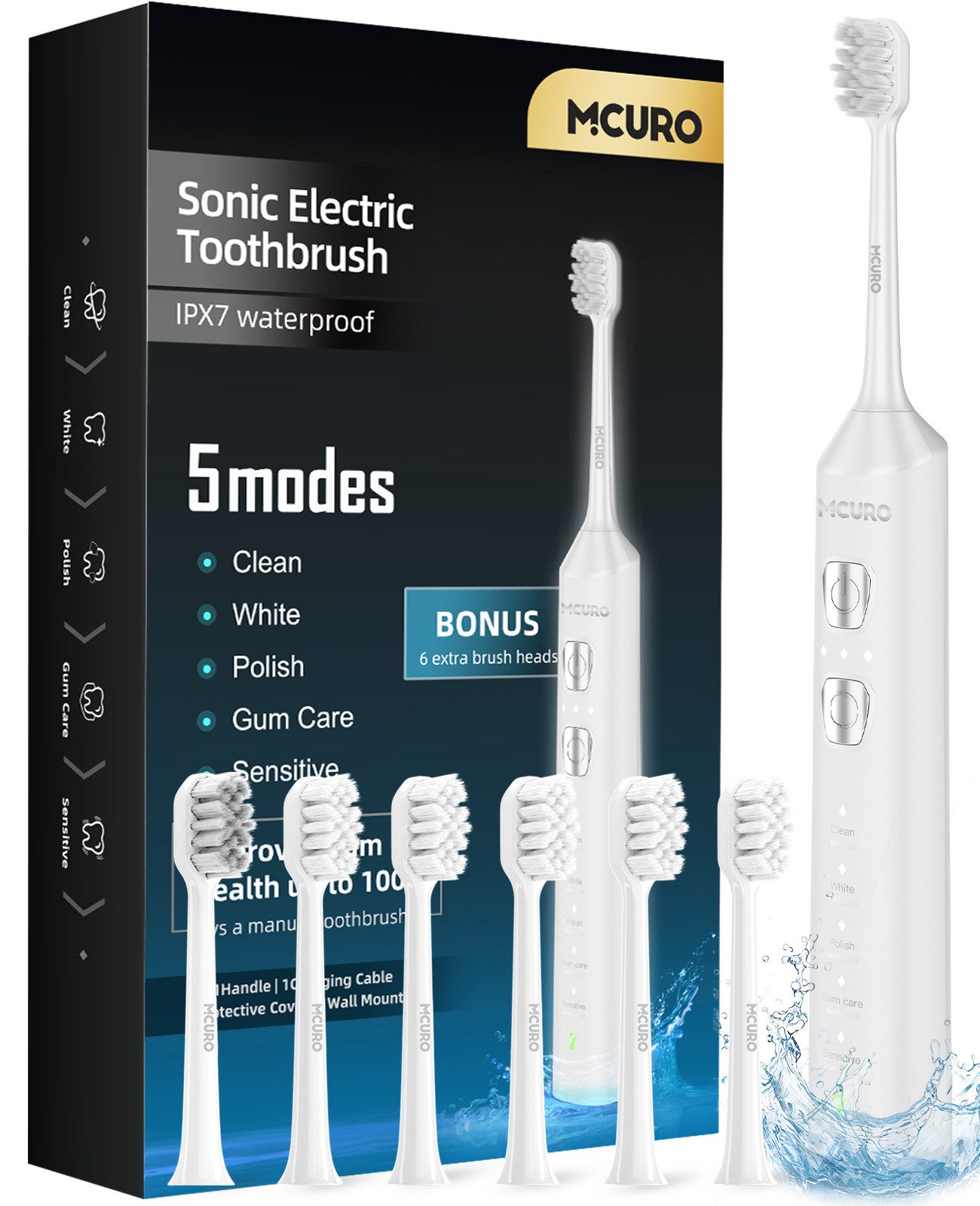 | Lieferumfang | 1 Elektrische Zahnbürste 6 Ersatzbürstenköpfe 1 kabellose Ladestation 1 Wandhalterung 1 Bedienungsanleitung |
