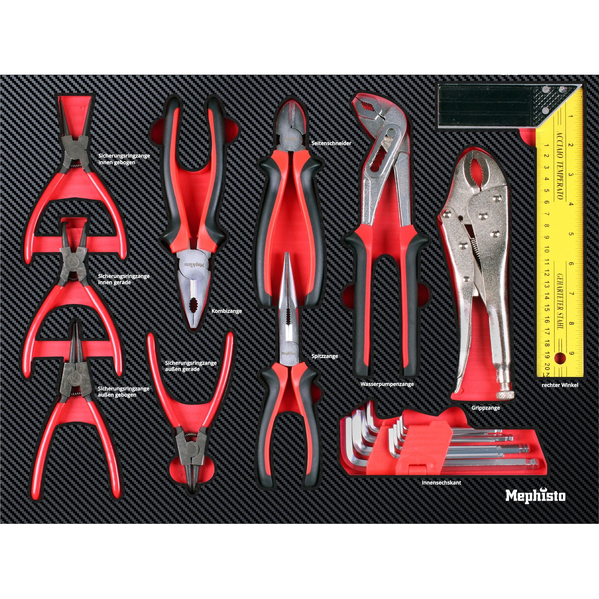 | Ausstattung | Innen- und Aussensprengring-, Kombi-, Grippzange, Seitenschneider |