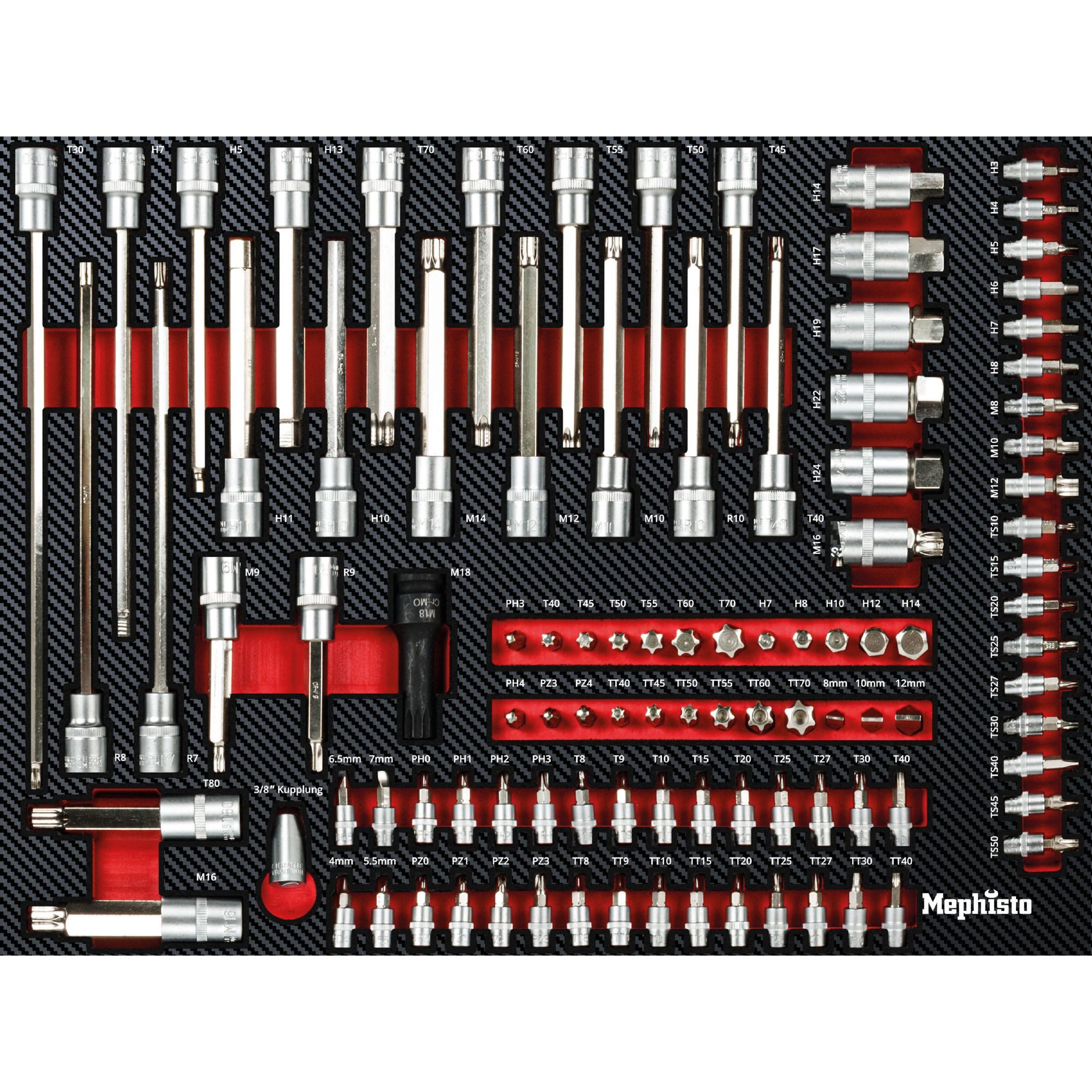 | Ausstattung | Steckschlüssel- und Bitsatz, Steckschlüsseleinsatz für 1/4" und 1/2" Aufnahme (PH-, T-, M-, H-, TT-, SL-, HW-, R-), 1x M18 Vielzahn für Schlagschrauber |