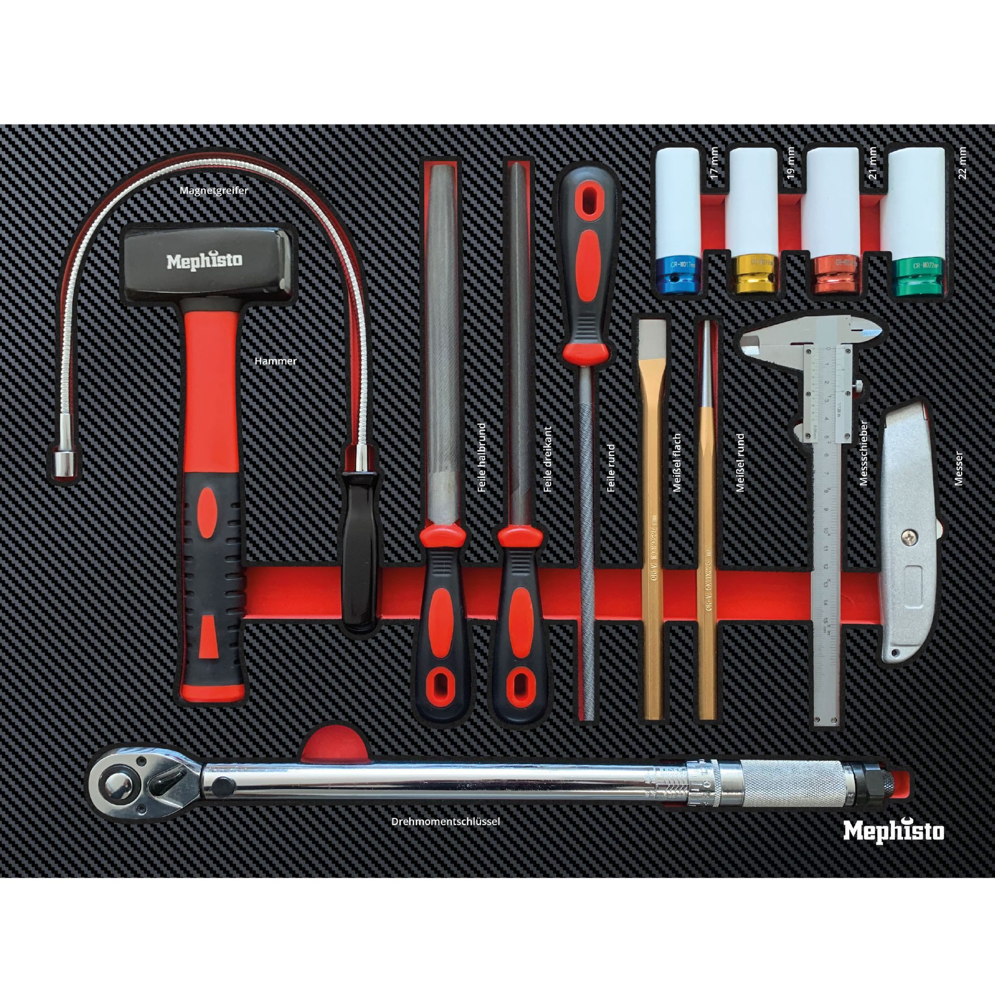 | Ausstattung | Drehmomentschlüssel, gummierte Felgennüsse 800 g Hammer (Fäustling), magnetischer Greife Meisel und Metallfeilen-Set |