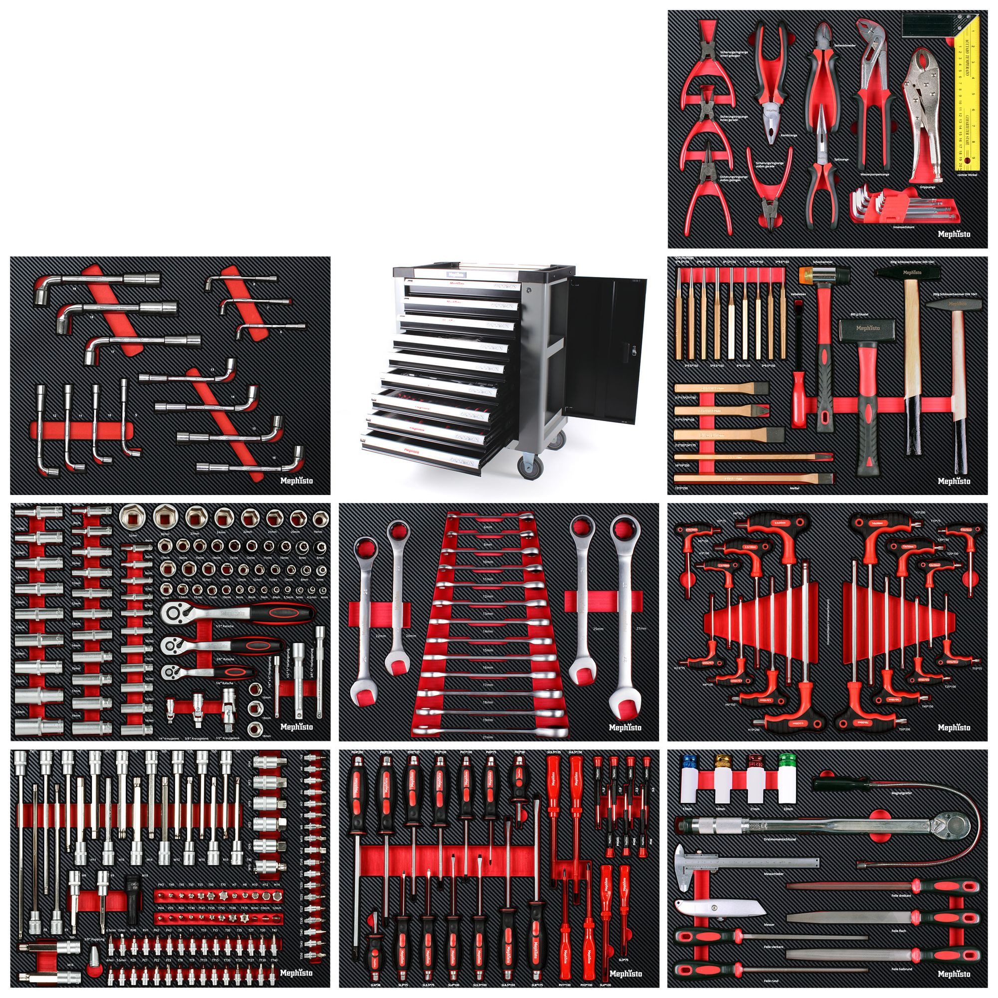 | Ausstattung | 9 Schubladen befüllt mit hochwertigen Werkzeugen, ordentlicher Schiebegriff, Werkzeugeinlagen aus flexiblem Schaumstoffmaterial |
