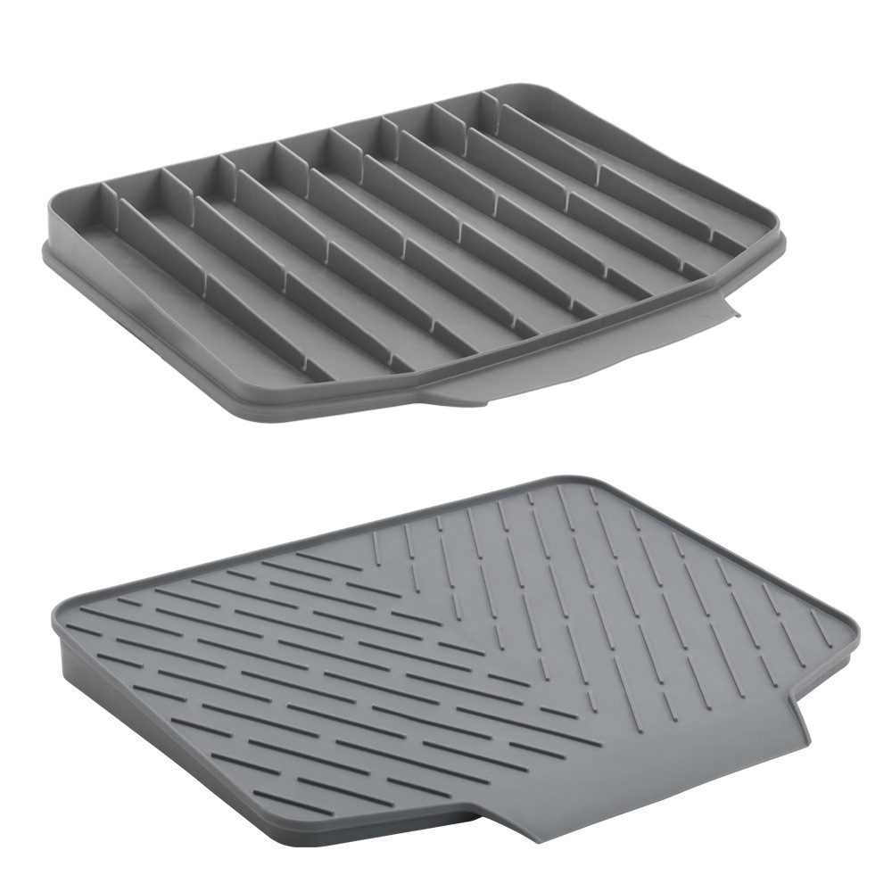 Gravity-Duo ist die durchdachte 2-in-1-Abtropfmatte für den Alltag – praktisch, platzsparend und stilvoll. Eine leicht geneigte Fläche mit integriertem Ausguss leitet überschüssiges Wasser direkt in die Spüle – ideal für gespültes Geschirr, Gläser, Besteck sowie Töpfe und Pfannen. Auf der anderen Seite eine flache, geschlossene Schale, diese fängt das Wasser zuverlässig auf – perfekt, wenn nur wenig Platz zur Verfügung steht oder nur ein paar Teile gespült wurden. Dank ihres kompakten Designs findet die Gravity-Duo Abtropfmatte mühelos neben jeder Spüle Platz und erweitert Ihre Abtropffläche ganz ohne dauerhaftes Chaos. Das schlichte Grau fügt sich harmonisch in jede Küche ein – und nach dem Gebrauch kann die Matte einfach im Schrank verstaut werden.