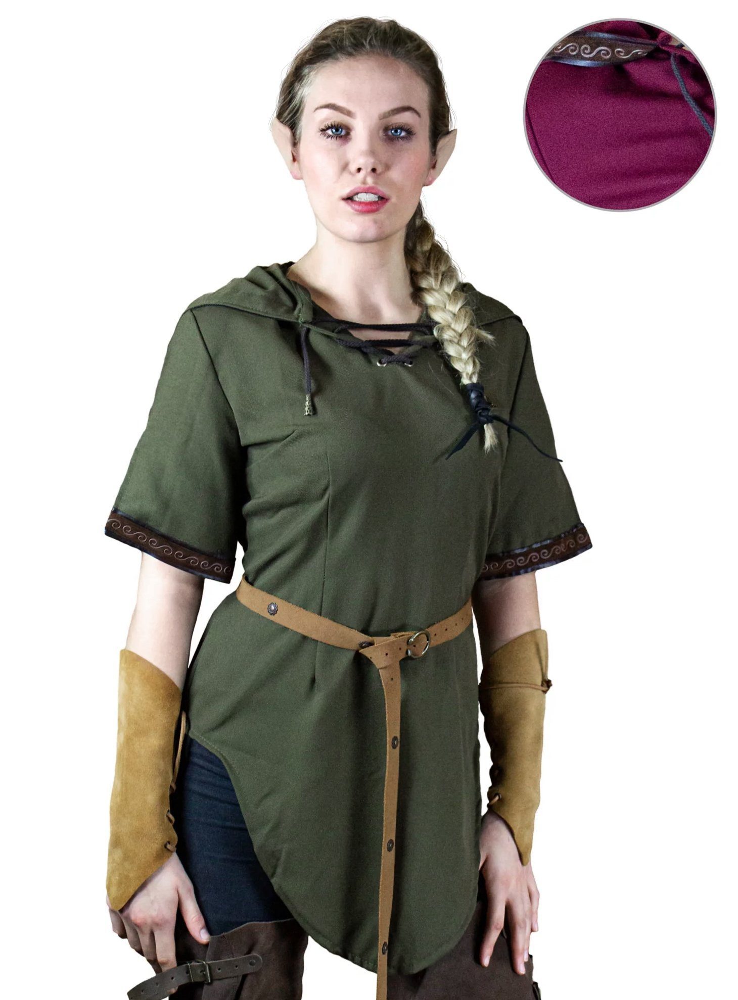 Diese Tunika einer Waldläuferin ist sehr bequem und lässt sich mit vielen anderen Kleidungsstücken kombinieren. Sie ist aus hochwertigem Twill gefertigt und hat eine breite Kapuze und kurze Ärmel, die mit verschiedenfarbigen Leder- und Velourslederbesätzen verziert sind. Sie eignet sich perfekt als Basisteil einer elfischen Gewandung.