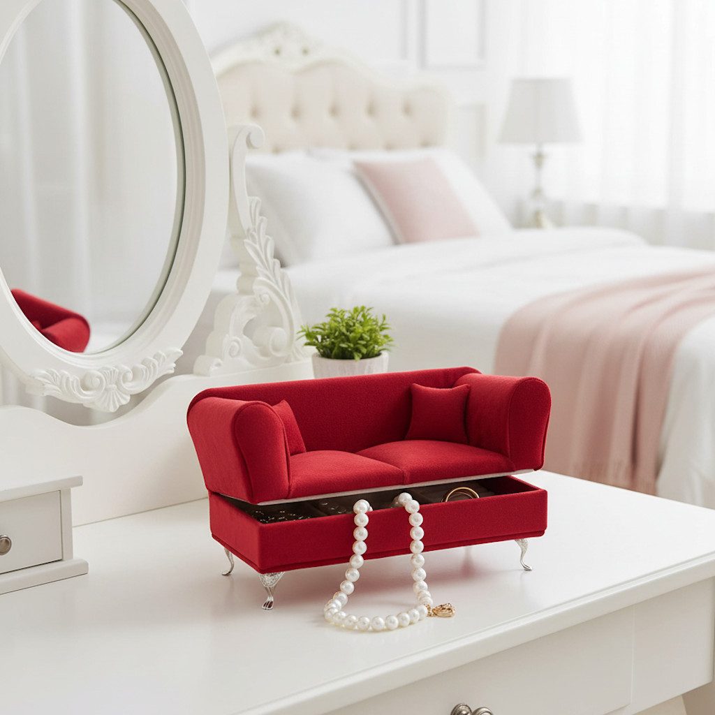Ein edler Hingucker für Ihre Schmucksammlung – der Schmuckkasten Canape in luxuriösem Dunkelrot. Gefertigt in aufwendiger Handarbeit, überzeugt er mit seiner charmanten Sofaform, die an ein stilvolles Canape erinnert. Die samtige Oberfläche aus hochwertigem Polyester verleiht dem Schmuckkasten eine besonders weiche Haptik und setzt edle Akzente in Ihrem Raum. Die eleganten, geschwungenen Metallfüße runden das Design ab und sorgen für eine stabile Positionierung auf Ihrem Tisch oder Ihrer Kommode. Perfekt geeignet zur stilvollen Aufbewahrung von Schmuckstücken, kleinen Accessoires oder als dekoratives Highlight. Eigenschaften: Material: Holz, Kunststoff, Metall, Textil (Polyester) Farbe: Dunkelrot in edler Samtoptik Freistehend, ideal für Tisch und Kommode Handgefertigtes Unikat Hochwertiges Innenfutter aus Polyester Maße: Länge: 22 cm Breite: 10 cm Höhe: 13 cm