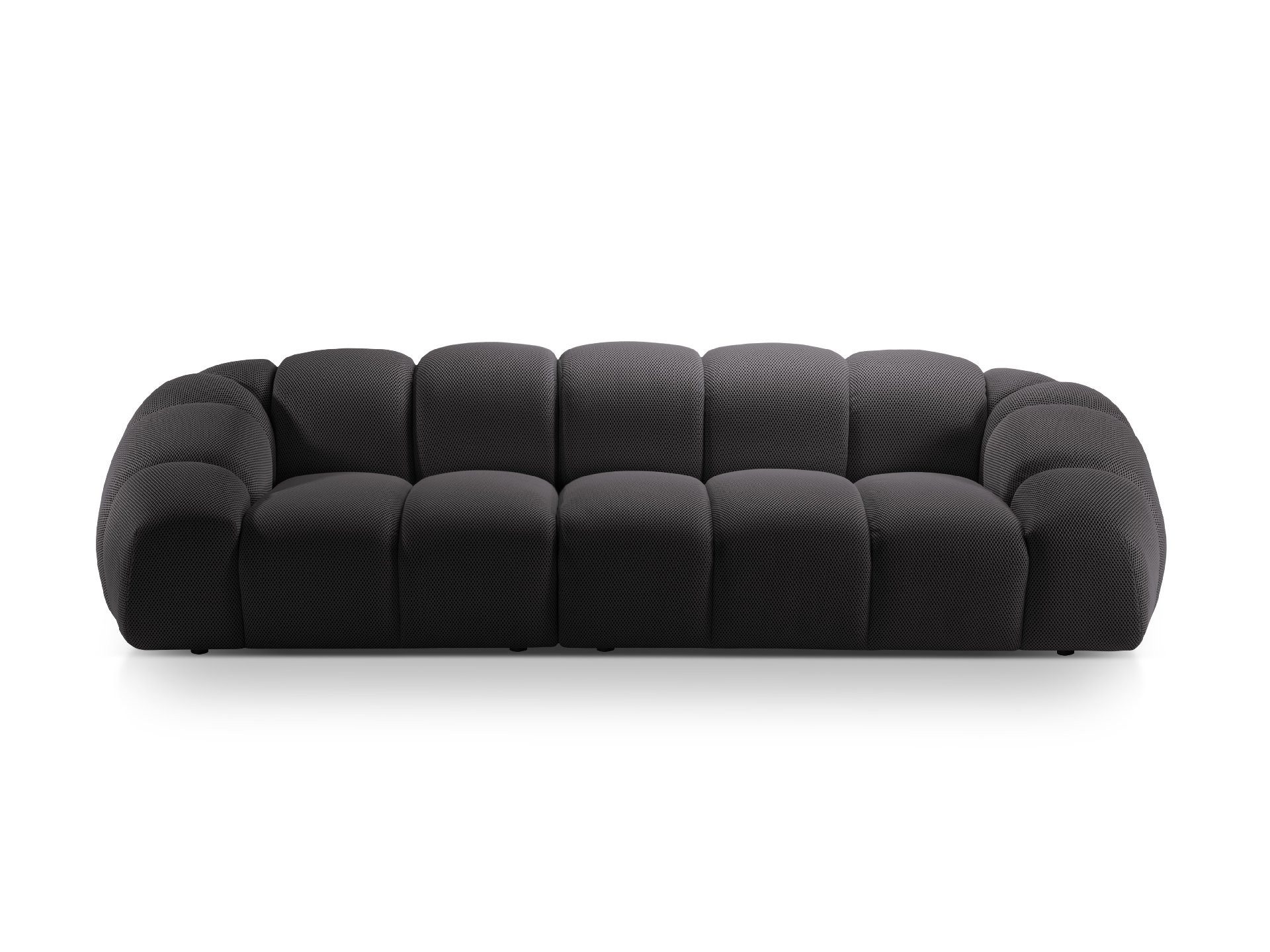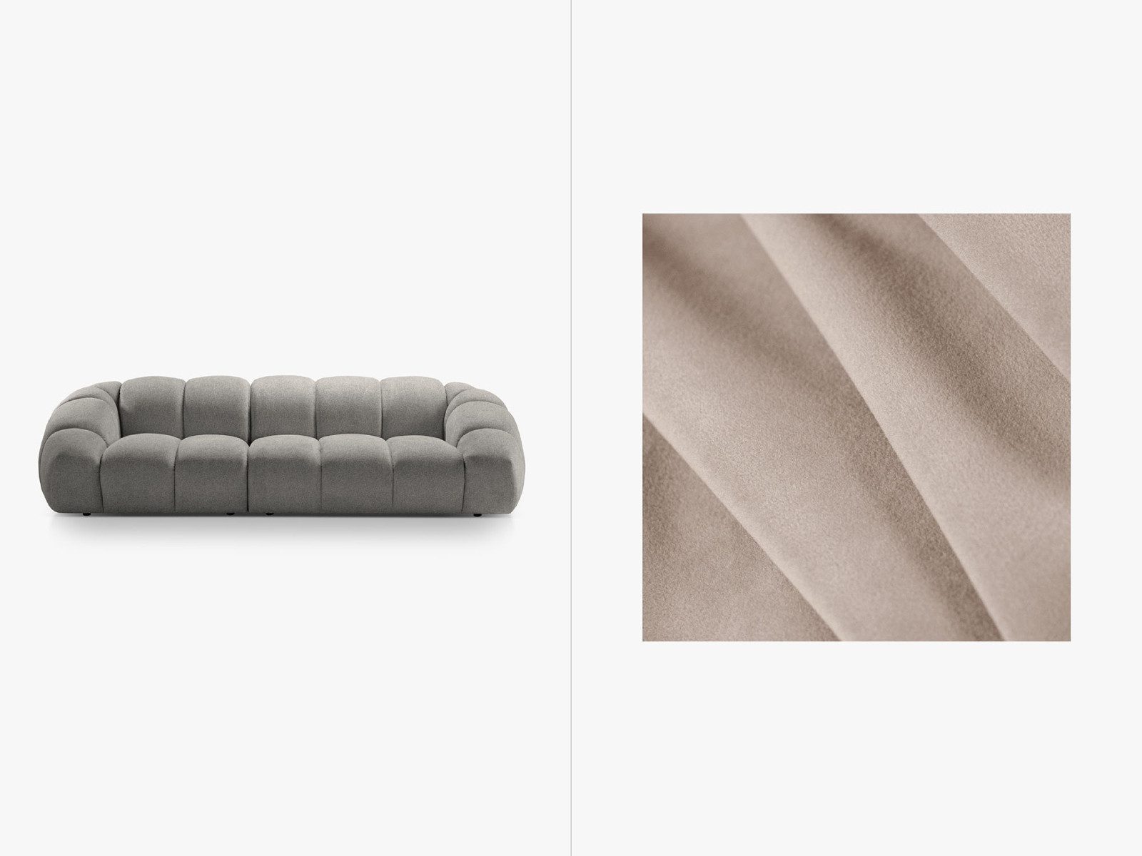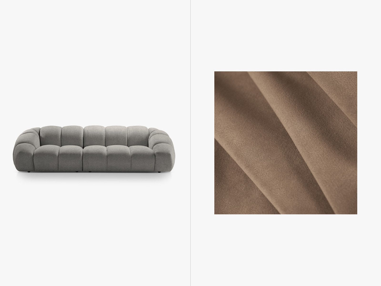 Das Diana Sofa kombiniert den strukturierten Samtstoff mit dem modernen 3D-Stoff - eine echte Augenweide, die in jedem Raum auffällt. Die sanft abgerundeten Formen und die komfortable Polsterung machen das Sitzerlebnis perfekt. Die schwarzen Kunststoffbeine (4 cm hoch) sorgen für Stabilität und verleihen dem Sofa einen schwebenden Look.