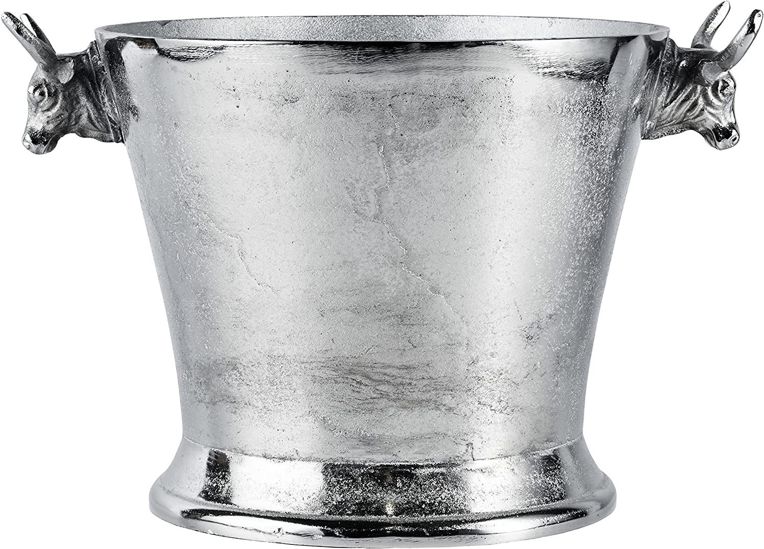 Wunderschöner Champagnerkühler mit 2 Stierköpfen an den Seiten. Wenn du auch mal wieder deine Freunde und Gäste mit gekühlten Getränken verwöhnen möchtest, dann eignet sich dieser Flaschenkühler bestens dafür. Der mit Eiswürfeln gefüllte Flaschenkühler sorgt den ganzen Abend für perfekt gekühlte Getränke. Der Champagnerkühler ist optimal geeignet für die nächste Hochzeit, Gartenparty oder Firmenfeier. Natürlich macht sich der silberfarbene Flaschenkühler auch sehr gut in der Gastronomie, einer schicken Bar, oder einem Hotel. Gerade die Farbe Silber ist im Bereich der Wohnaccessoires und Möbel sehr zeitlos und gut in jeden Wohnstil integrierbar. Außerdem versprüht die Farbe Silber immer einen Hauch von Luxus und Eleganz. Je nach Größe der Flasche, eignet sich der Champagnerkühler für 1 - 2 Flaschen. Die Fertigung des Flaschenkühlers ist zu 100 % von Hand erfolgt und wurde mit viel Leidenschaft ausgeführt. Die Oberfläche des Champagnerkühlers wurde nicht poliert, daher besitzen sie eine wunderschöne Oberflächenstruktur und "RAW"-Optik.