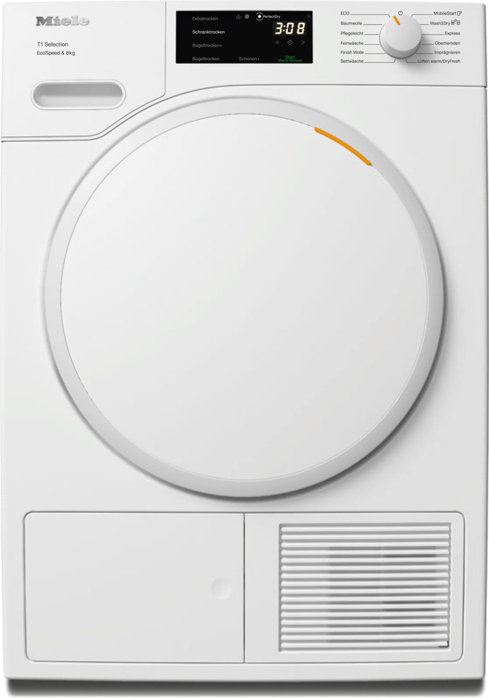 Mit dem TSB643WP EcoSpeed&8kg präsentiert Miele einen leistungsstarken Wärmepumpentrockner. Optimale Werte im Hinblick auf den Energiebedarf liefert dieser Wärmepumpentrockner mit der Energieeffizienzklasse C (Skala: A bis G). Mit 8 kg Fassungsvermögen eignet sich der Wärmepumpentrockner vor allem für Familien mit bis zu 4 Personen. Dank der besten Kondensationseffizienzklasse A erhöht sich die Luftfeuchtigkeit in der Umgebung des Trockners nur minimal. Das beugt Schimmelbildung vor und Sie verlieren keine Wärme im Raum durch häufiges Lüften. Via Startzeitvorwahl ist es möglich, das Programm des TSB643WP EcoSpeed&8kg Wärmepumpentrockners so einzustellen, dass die Wäsche fertig ist, wenn man zum Beispiel von der Arbeit zurückkommt. Die übrige Programmdauer wird auf der Restlaufanzeige angezeigt. So weiß man immer, wie lange der Wärmepumpentrockner noch für das Trocknen benötigt. Da angezeigt wird, wann der Wasserbehälter entleert, der Filter gereinigt werden sollen, hat man alle relevanten Informationen zur Reinigung im Blick. Die Innenbeleuchtung des TSB643WP EcoSpeed&8kg Wärmepumpentrockners erhellt die Wäschetrommel, wenn man sie befüllt oder entleert. Mit den Abmessungen von 59,6 cm x 85 cm x 65,5 cm (BxHxT) vereint der Wärmepumpentrockner Form und Funktion auf attraktive Weise.