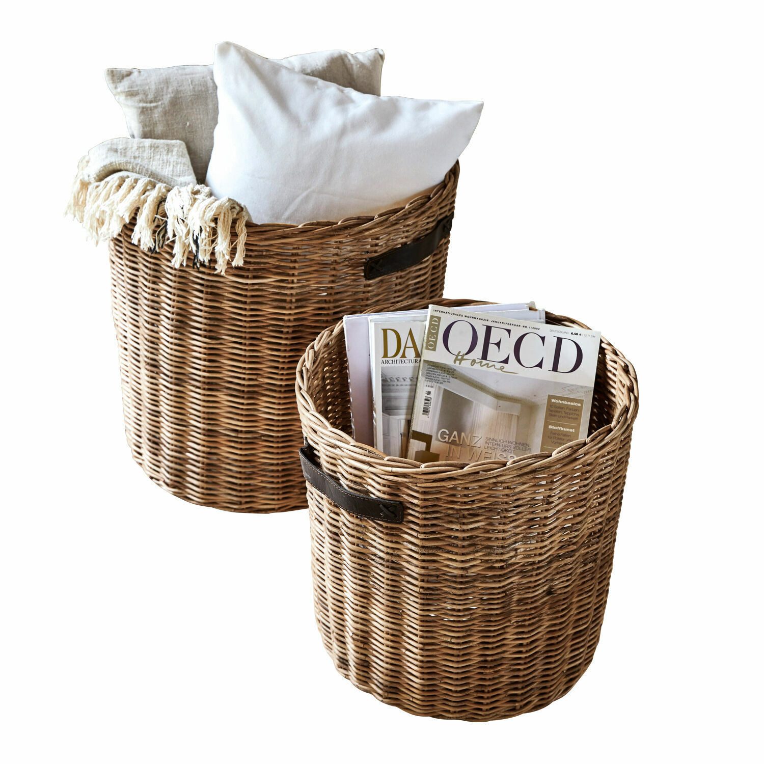 Natürliches Rattan-Geflecht. Henkel aus Büffelleder. Sehr vielseitig verwendbar. Holen Sie sich mit diesem zeitlosen Duo die Natur nach Hause und schaffen Sie ganz leicht Ordnung. Die formschönen Körbe lassen sich auf viele Arten nutzen - zum Aufbewahren von Gegenständen wie vielleicht Spielzeug, Hundeleine und Bälle, Kosmetikartikel oder Accessoires aus der Küche, hier sind Sie völlig frei. Auch für Utensilien zum Arbeiten oder Basteln bieten die attraktiven Designs viel Raum. So kehrt eine ordentliche Optik ein und Sie haben immer alles gleich zur Hand. Ein schöner Akzent zu jedem Ambiente ist das Doppel in zwei Größen noch dazu.