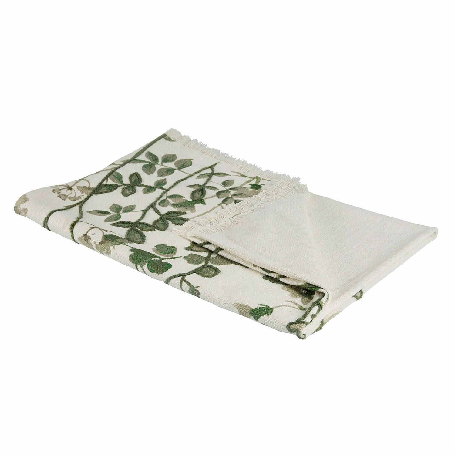 Filigrane Stickereien verleihen den botanischen Motiven spürbare Tiefe. Das Spiel aus Druck und Textur macht jede Ecke dieses Plaids zum Blickfang. Leicht gewebter Stoff mit natürlichem Charakter – dekorativ und gemütlich zugleich. Dieses Plaid begeistert mit einem feinen Zusammenspiel aus Druck und Stickerei: Während sich zarte Ästchen in Grüntönen über den Stoff ziehen, setzen sorgfältig gestickte Elemente spannende Akzente. Der helle, gewebte Untergrund bringt die botanischen Motive besonders schön zur Geltung. Ideal zum Drapieren über Sofa, Sessel oder am Fußende des Bettes.