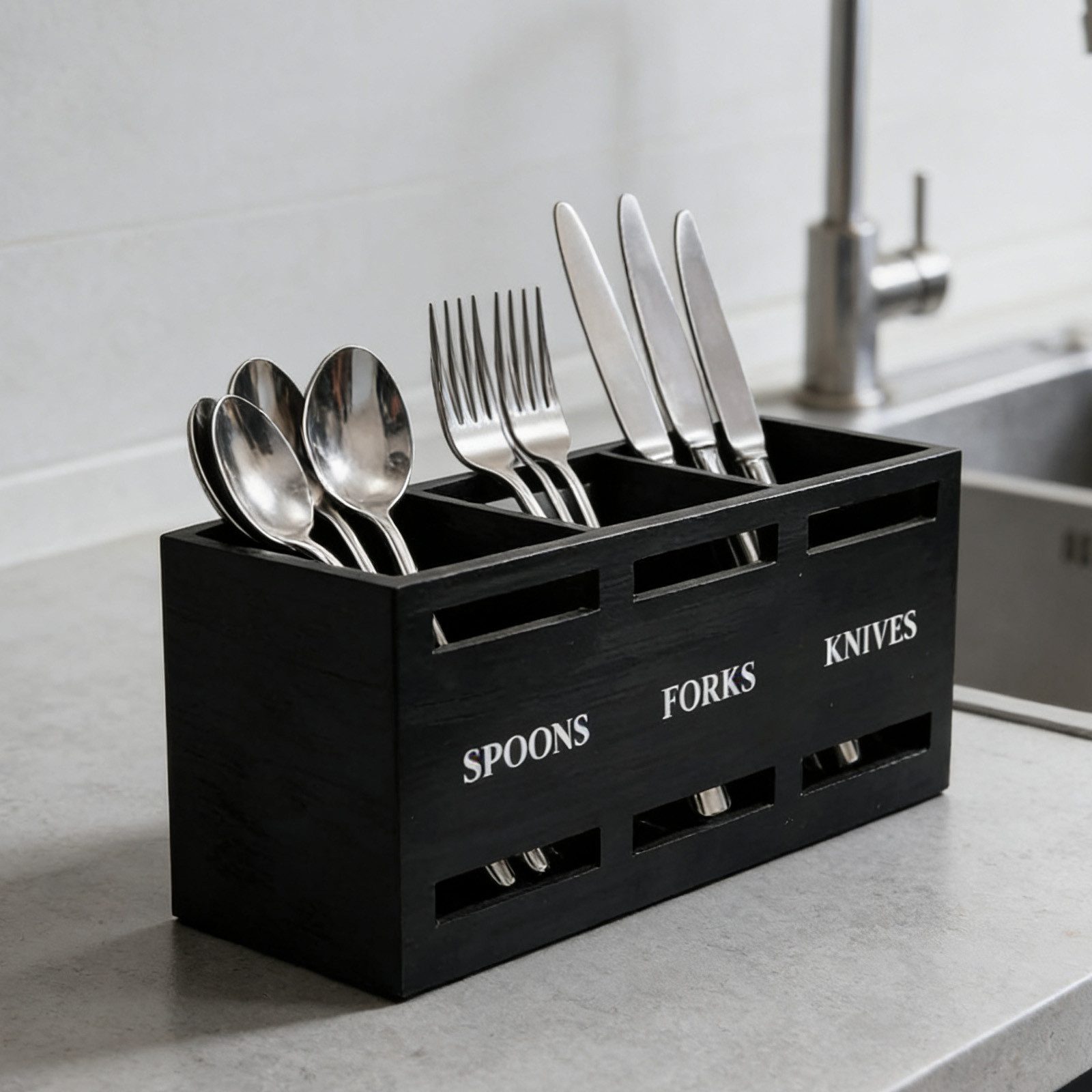 Durch die effiziente Struktur eignet er sich besonders gut für voll ausgestattete Küchen, in denen Ordnung und schneller Zugriff entscheidend sind.