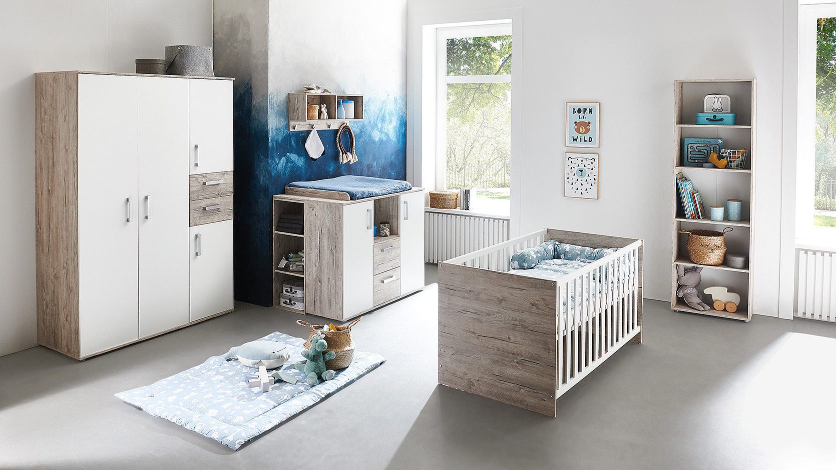 Schaffen Sie mit dem Babyzimmer Bente eine stilvolle, praktische und gemütliche Umgebung für Ihr Baby. Dieses 6-teilige Komplett-Set in modernem Design kombiniert warme Eiche Sand-Dekore mit zeitlosem Weiß und schafft so ein harmonisches Ambiente, in dem sich Ihr Kind wohlfühlen wird.