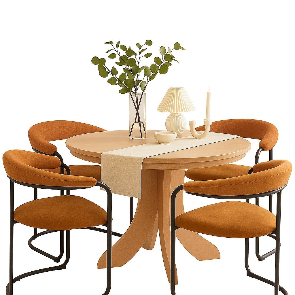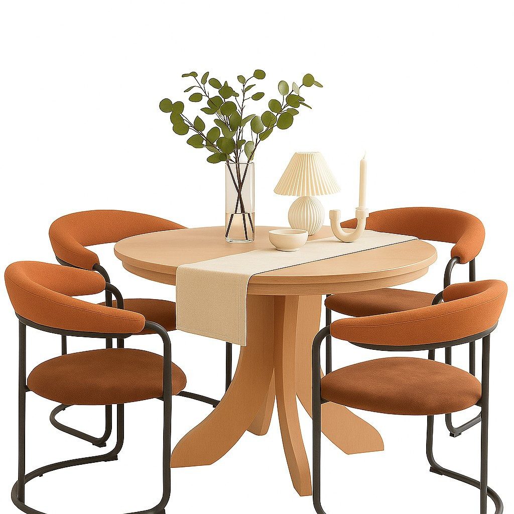 Diese Tischgruppe vereint modernes Design, pflegeleichte Materialien und hohen Sitzkomfort. Der runde Esstisch aus Holzwerkstoff mit Melamindekor in Buche-Nachbildung lässt sich im Handumdrehen von Ø 90 cm auf 130 cm erweitern – die ca. 40 cm breite Einlegeplatte wird einfach eingesetzt. Vier Stühle mit schwarzem, pulverbeschichtetem Stahlrohrgestell sowie bequemer Schaumstoffpolsterung sorgen für entspanntes Sitzen. Die Sitzflächen in Samtoptik und Rückenflächen mit Strukturstoff (je 100 % Polyester) sind farblich perfekt aufeinander abgestimmt.