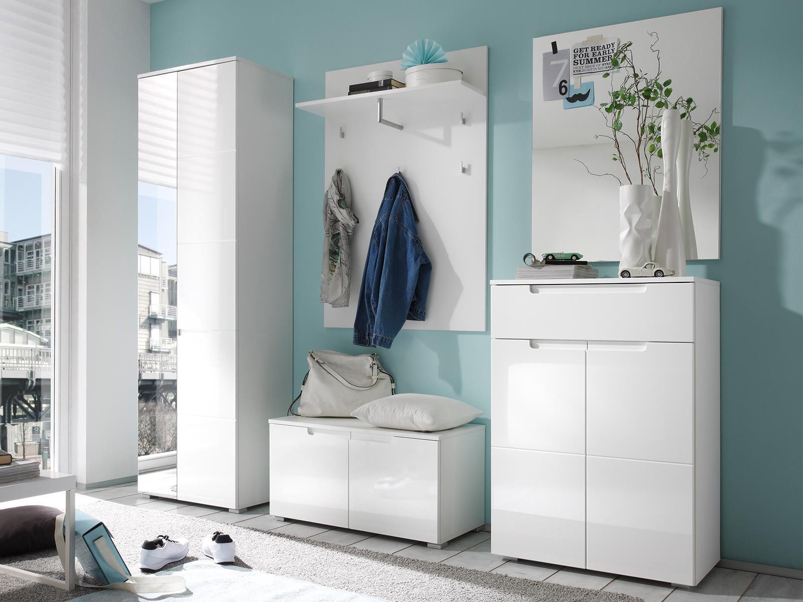 Mit einer Kombination aus strahlendem weiß-Hochglanz und frischem weiß sorgt die Garderobe "Suzette I" für einen glänzenden Auftritt in deinem Eingangsbereich. Das Spiegelglas rundet das optische Erscheinungsbild der Garderobe nicht nur ab, sondern wertet dieses sogar auf.