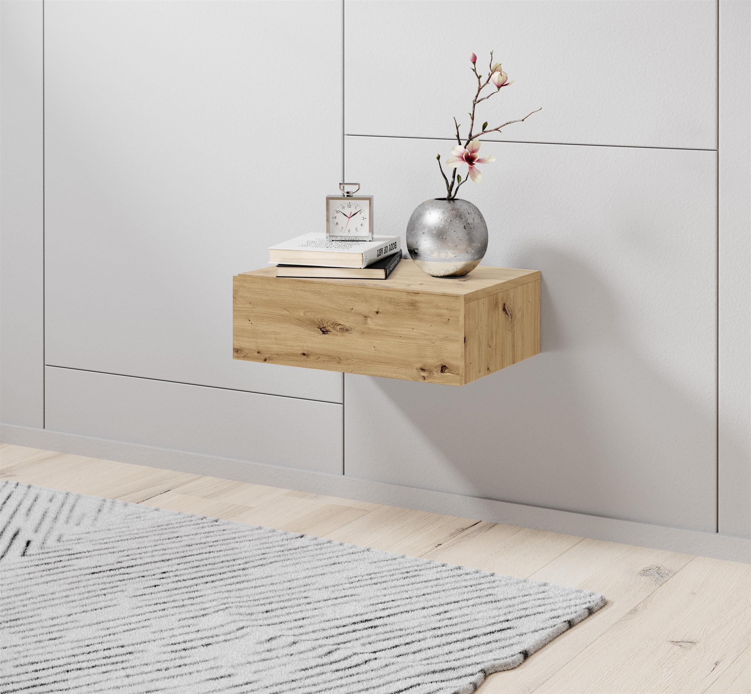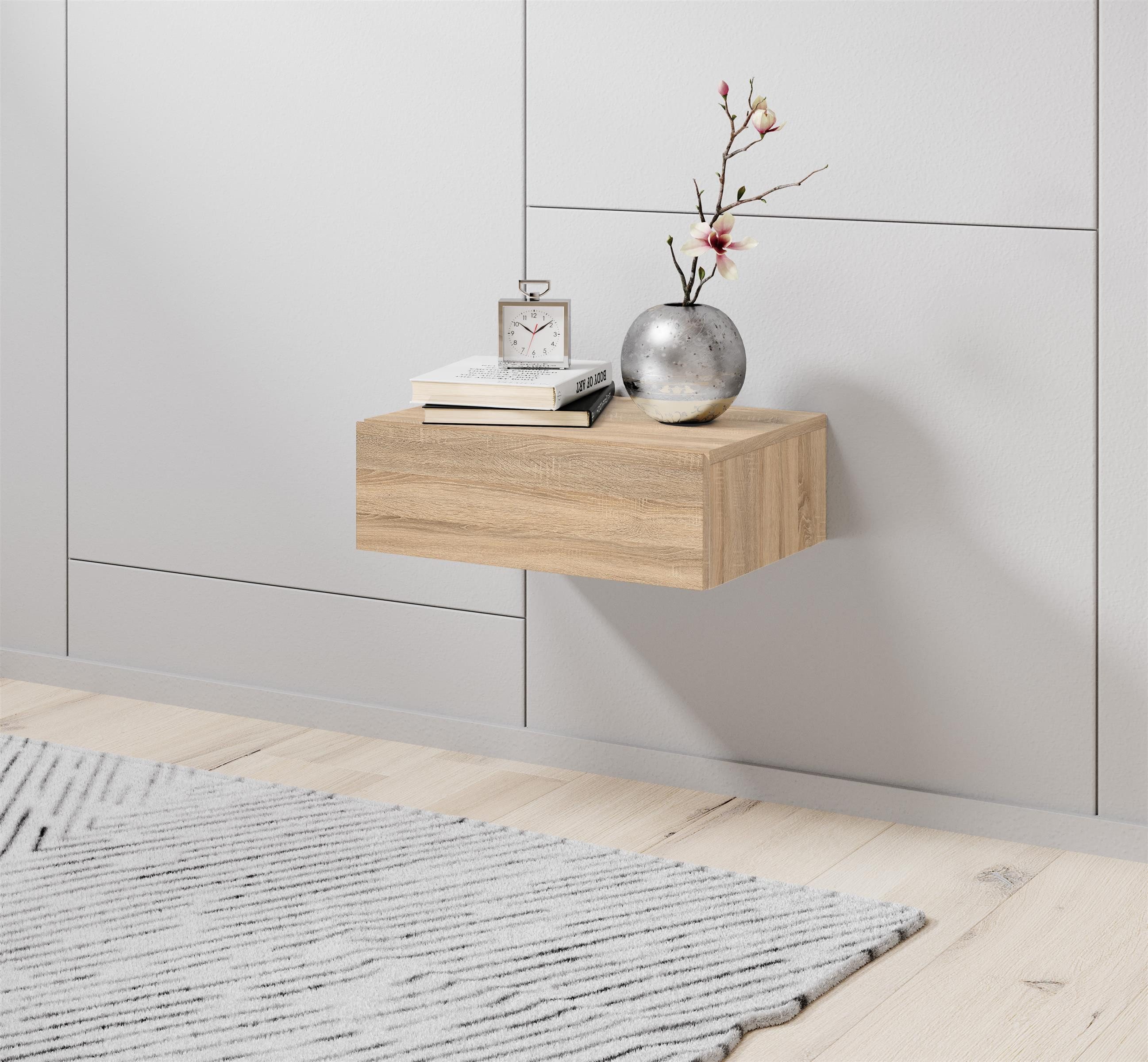 Die hängende Nachtkommode "Thorben I" ist hier in Sonoma-Eiche Nachbildung erhältlich und punktet optisch mit ihrer grifflosen Front. Das schlichte Design passt zur reduzierten Formensprache und unterstreicht den modernen Stil.