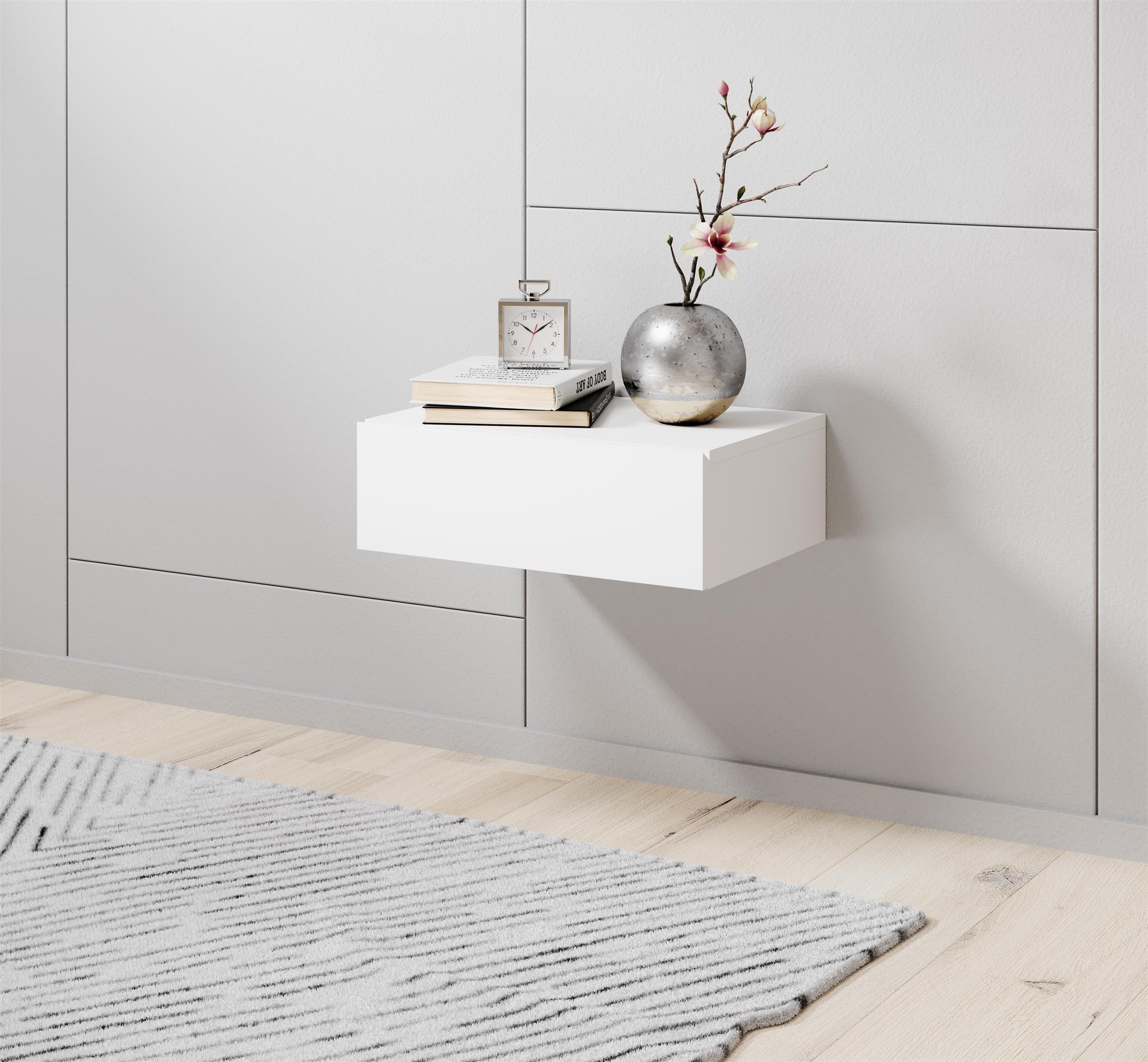 1 leichtgängiger und geräumiger Schubkasten bietet reichlich Platz für all die Dinge, die in Bettnähe gehören sollen. Auf dem großzügigen Oberboden der "Thorben I" finden unter anderem Wecker, Nachttischlampe oder Bettlektüre Platz. Durch die schwebende Anbringung wird die Nachtkommode zum absoluten Blickfang im Schlafzimmer.