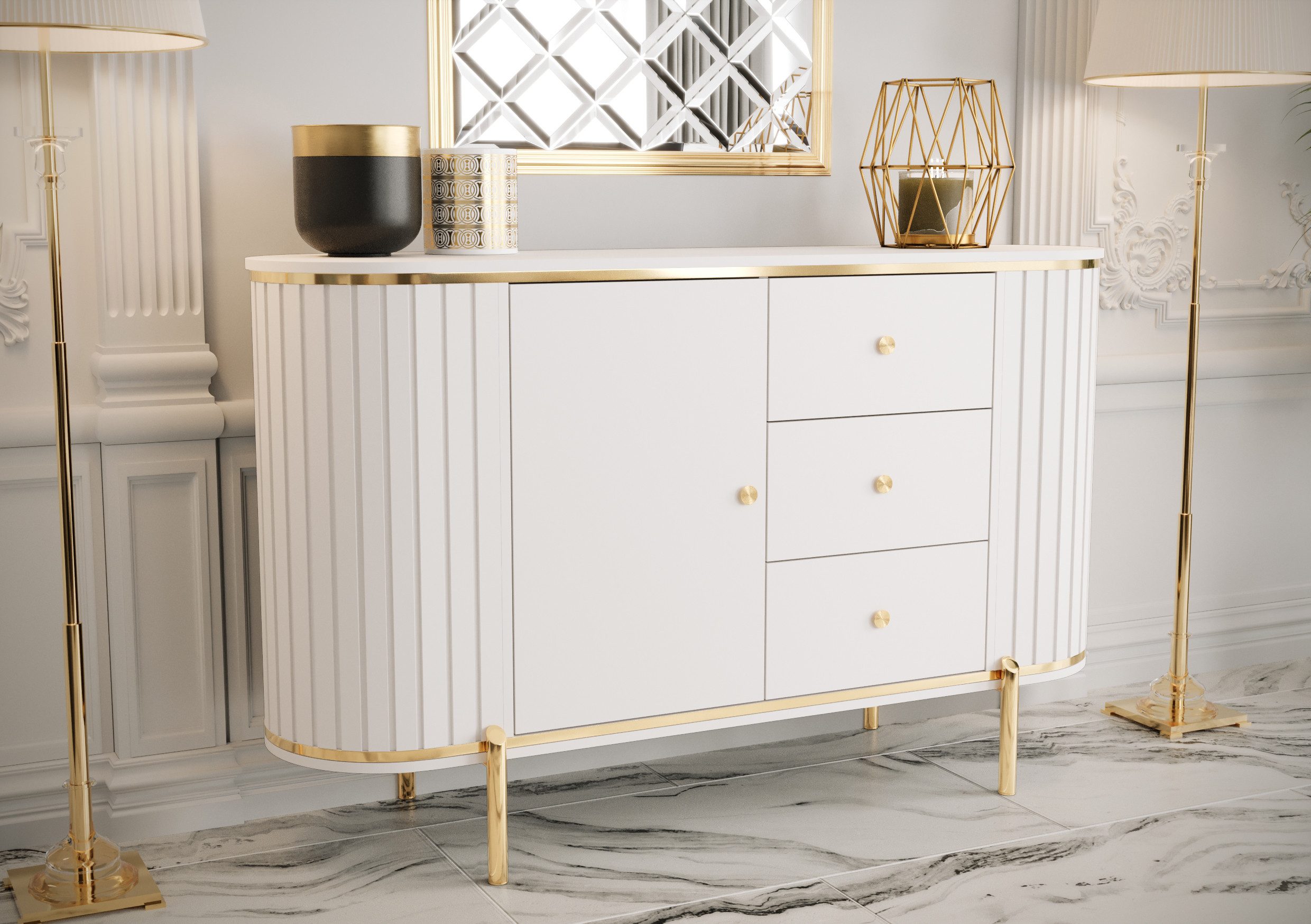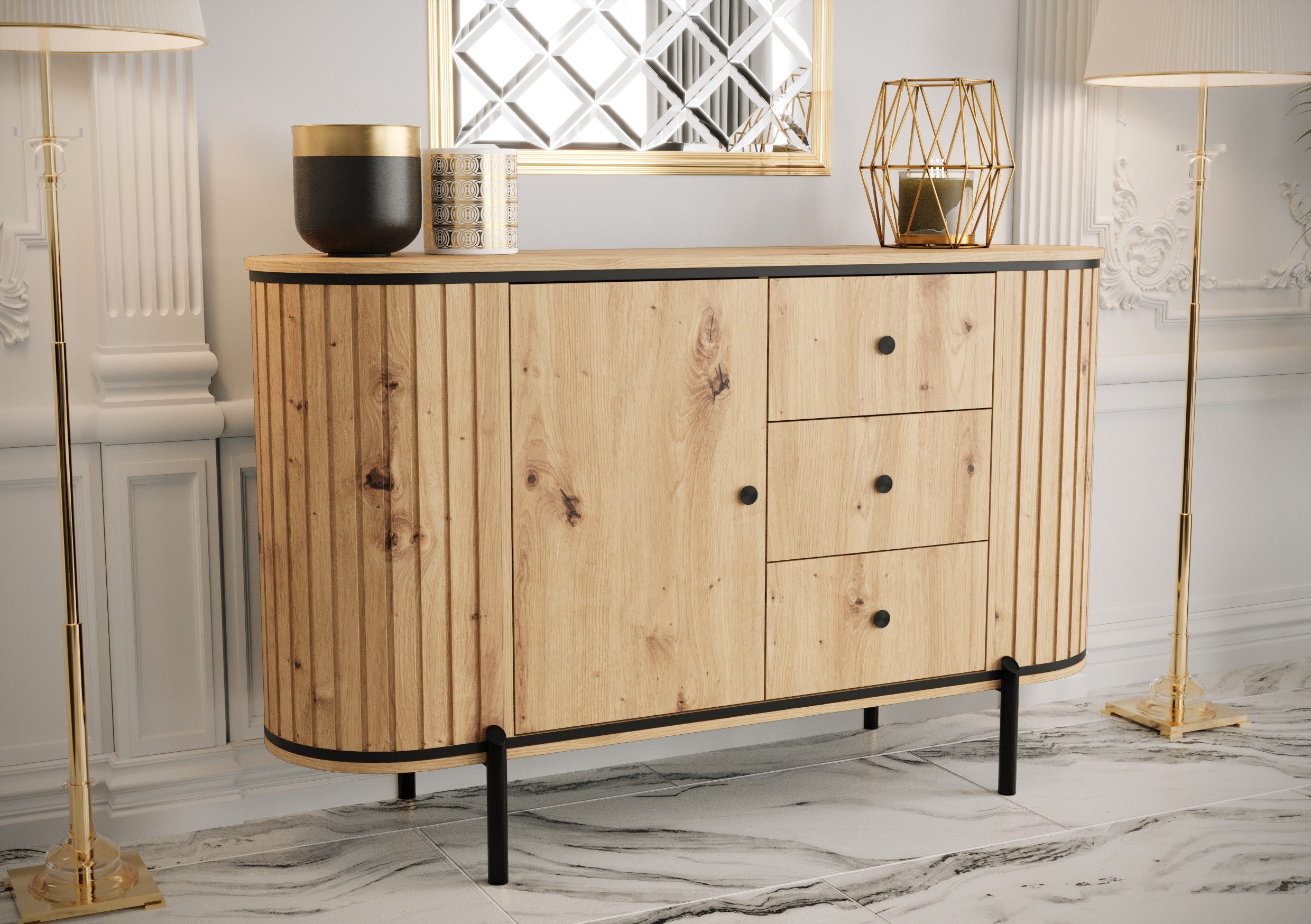 Dank der verstärkten Struktur und hochwertiger Beschläge eignet sich die Dallas Kommode ideal für den täglichen Gebrauch. Sie beeindruckt nicht nur durch ihre Optik, sondern vor allem durch ihre praktischen Funktionen: großzügige Schubladen mit Soft-Close-System sorgen für Komfort im Alltag, während die stabilen, höhenbetonten Metallfüße der Kommode Leichtigkeit und Modernität verleihen. Mit ihrem durchdachten Stauraumkonzept bietet sie ausreichend Platz für Kleidung, Dokumente oder Dekoartikel und hilft dabei, eine aufgeräumte Atmosphäre im Wohnbereich zu schaffen.