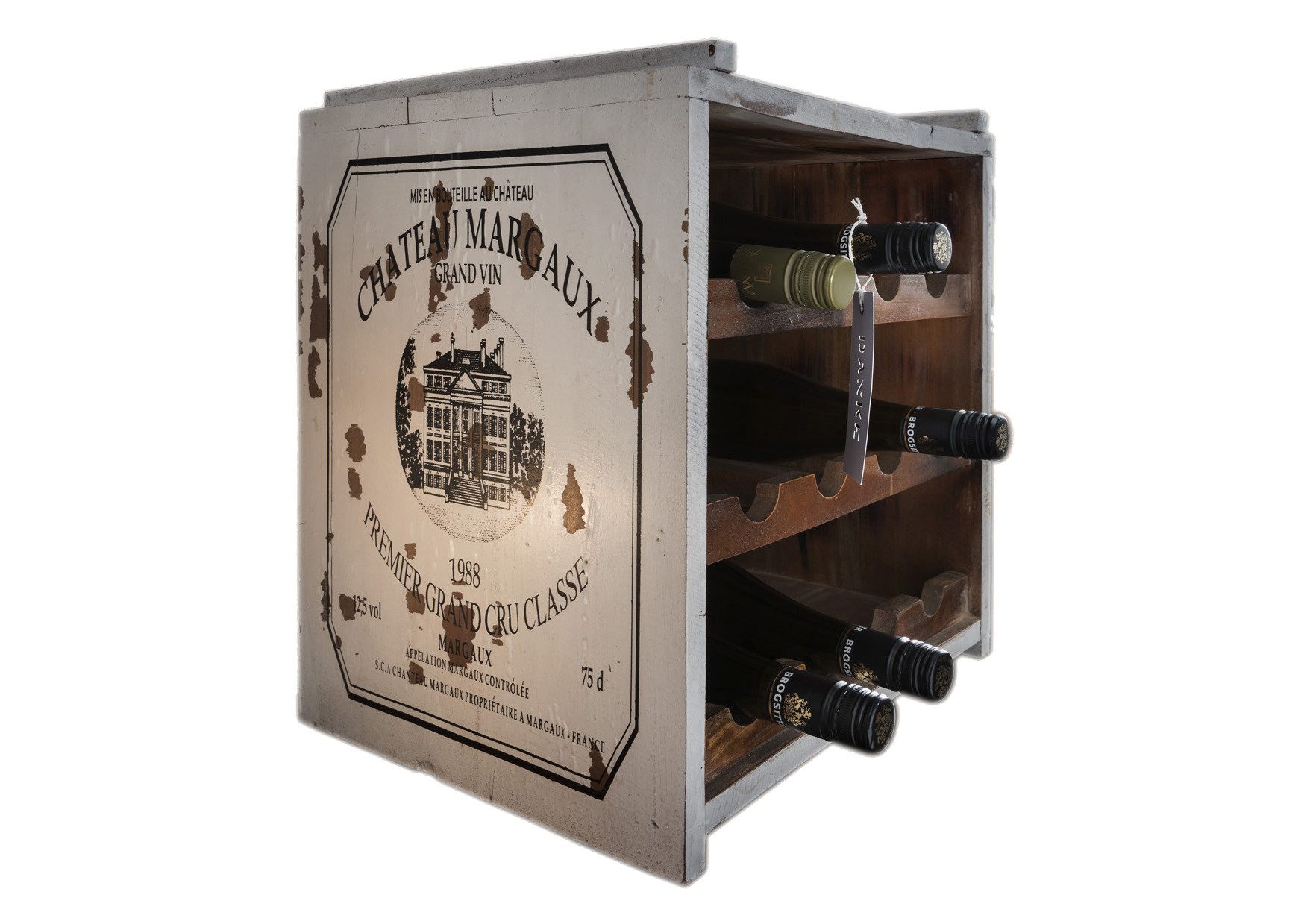 Hübsches Weinregal im Vintage-Stil mit nostalgischem Print an den Seiten. Die inneren Teile sind in Mahagoni natur, die Außenwände in vintage-weiß gestrichen. Durch die handliche Größe eignet sich das Regal auch für den kleinen Haushalt und läßt sich problemlos platzieren. Eine besonders schöne und dekorative Art, bis zu 12 Weinflaschen unterzubringen.