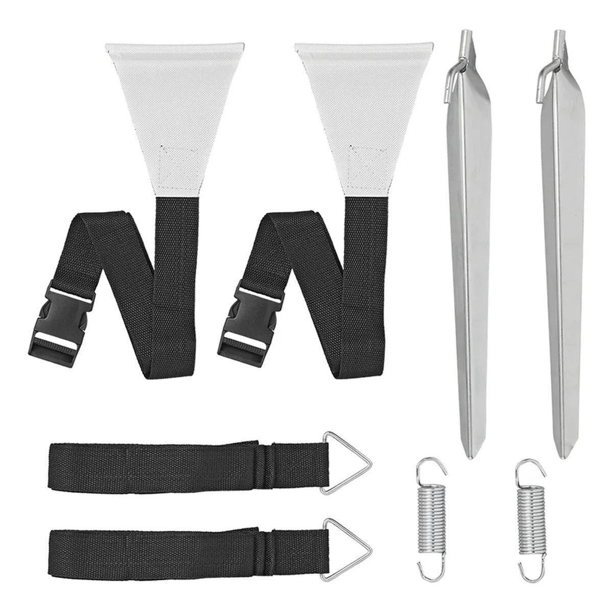 2x 320 cm Nylon-Spanngurte - 2x 87 cm Nylon-Spanngurt mit Kederbefestigung und Schnellverschluss - 2x 38 cm Sturmheringe - 2x 6 cm Feder