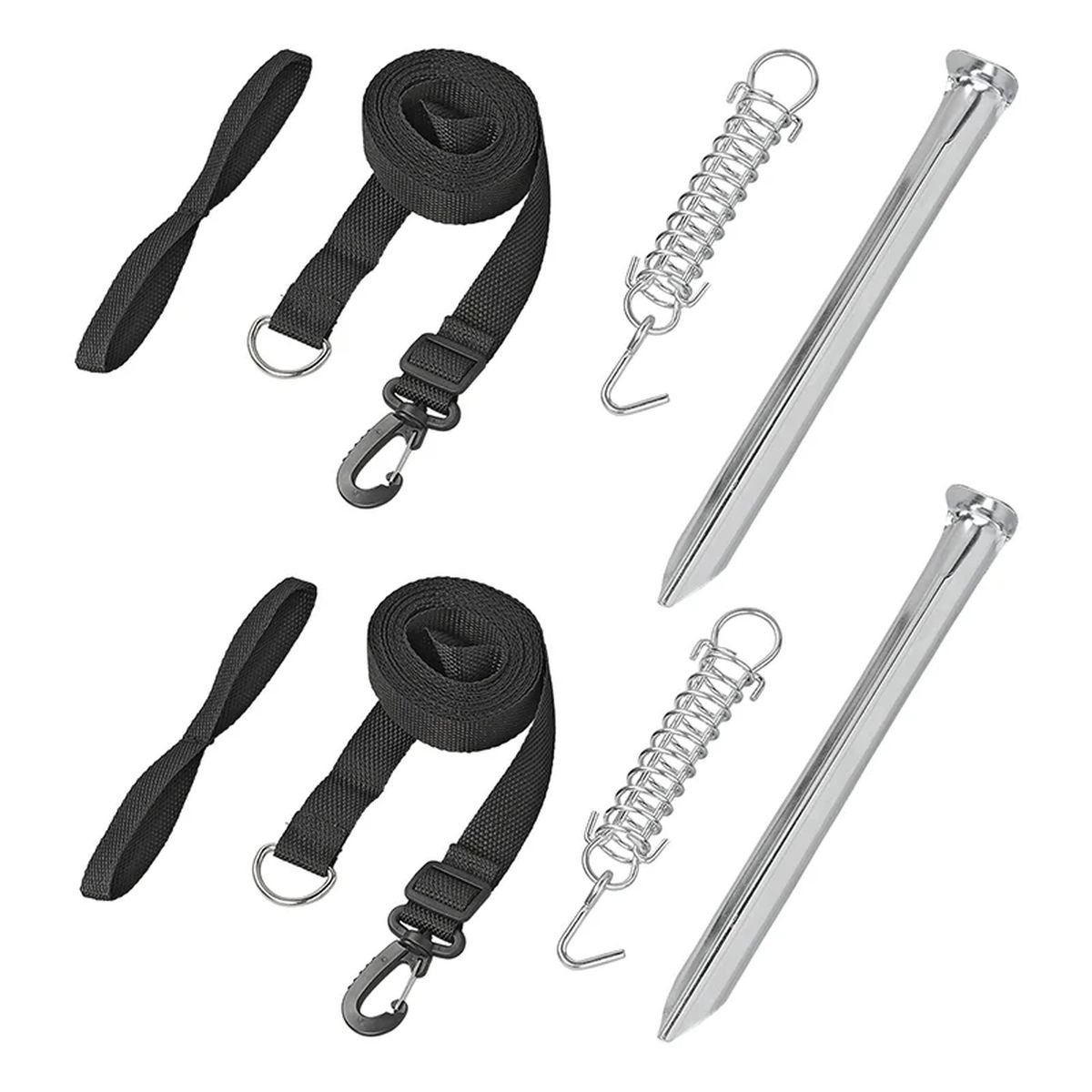 2x 300 cm Nylon-Spanngurte - 2x 19 cm Nylon-Befestigungsgurte - 2x 30,5 cm Sturmheringe - 2x 10,5 cm Feder