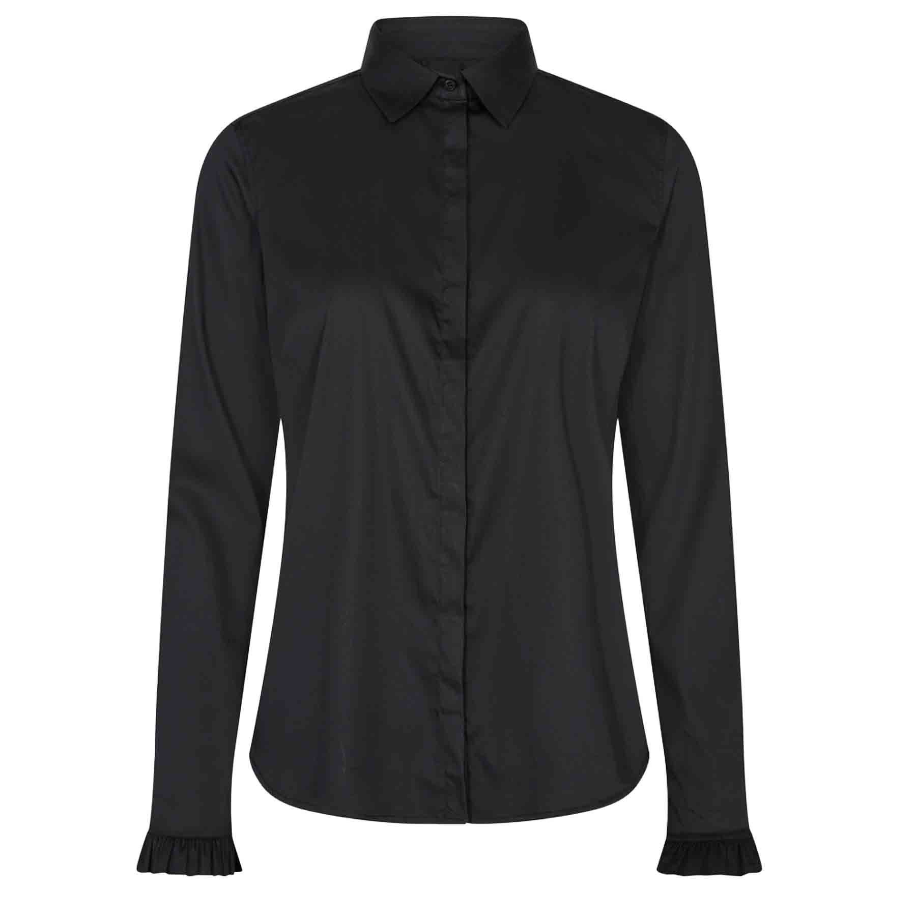 Die Hemdbluse MATTIE FLIP von MOS MOSH ist ein Klassiker, der nie aus der Mode kommt. Die exklusive Bluse in zeitlosem Schwarz besticht nicht nur durch ihre hochwertige Verarbeitung, sondern auch durch ihr zeitloses Design. Der leicht taillierte Schnitt verleiht der Bluse eine perfekte Passform, die Ihre Figur wunderbar betont, ohne einzuengen. Der Umlegekragen und die verdeckte Knopfleiste verleihen der Bluse eine zeitlose Eleganz, die in jeder Lebenslage stilvoll zur Geltung kommt. Besonders raffiniert sind die geknöpften Ärmelabschlüsse mit zarten Rüschen, die Ihrem Outfit einen Hauch von Verspieltheit und Romantik verleihen. Der abgerundete Saum rundet den Look ab und ermöglicht es, die Bluse sowohl über als auch unter Hosen oder Röcken zu tragen. Diese Bluse ist vielseitig kombinierbar und passt zu den verschiedensten Anlässen. Tragen Sie sie im Büro mit einer eleganten Hose und Pumps für einen souveränen Business-Look. Für den perfekten Freizeitlook kombinieren Sie die Bluse mit Ihrer Lieblingsjeans und Turnschuhen. Sie werden die hohe Qualität und den erstklassigen Stil dieser Bluse zu schätzen wissen. Entdecken Sie noch heute die Baumwollbluse MATTIE FLIP im HENNE Onlineshop und gönnen Sie sich ein Stück zeitlose Eleganz, das in Ihrer exklusiven Garderobe nicht fehlen darf. Genießen Sie den Luxus, den Ihnen diese Bluse bietet und lassen Sie sich von ihrer Vielseitigkeit begeistern.