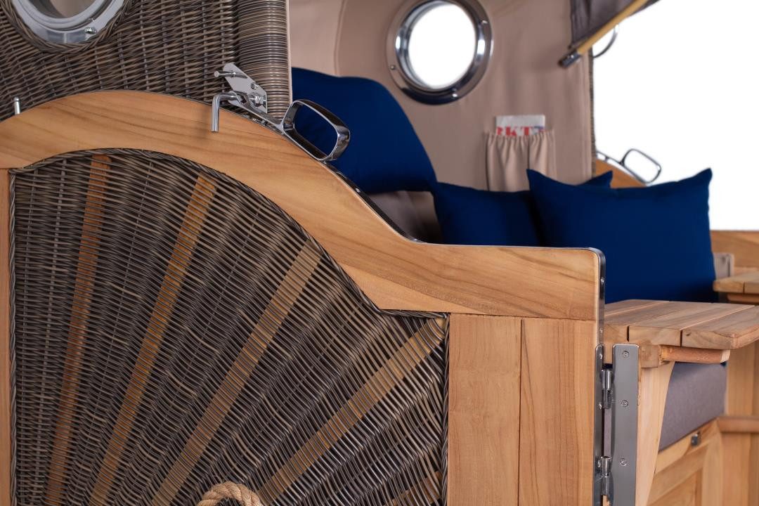 Das hochwertige und UV beständige PE-Rundgeflecht sorgt für eine angenehme Haptik und ist gleichzeitig wetterfest. Der Strandkorb ist somit ideal für den Einsatz im Freien geeignet. Mit seiner Volllieger-Funktion ermöglicht der Strandkorb eine bequeme Liegeposition, sodass Sie sich optimal entspannen können. Die rostfreien Beschläge aus V2A Edelstahl garantieren eine hohe Langlebigkeit und sind zudem witterungsbeständig. Die hochglanzpolierten Aluminium Bullaugen mit Sicherheitsglas verleihen dem Strandkorb nicht nur einen ansprechenden Look, sondern bieten auch Schutz vor Wind und Wetter.