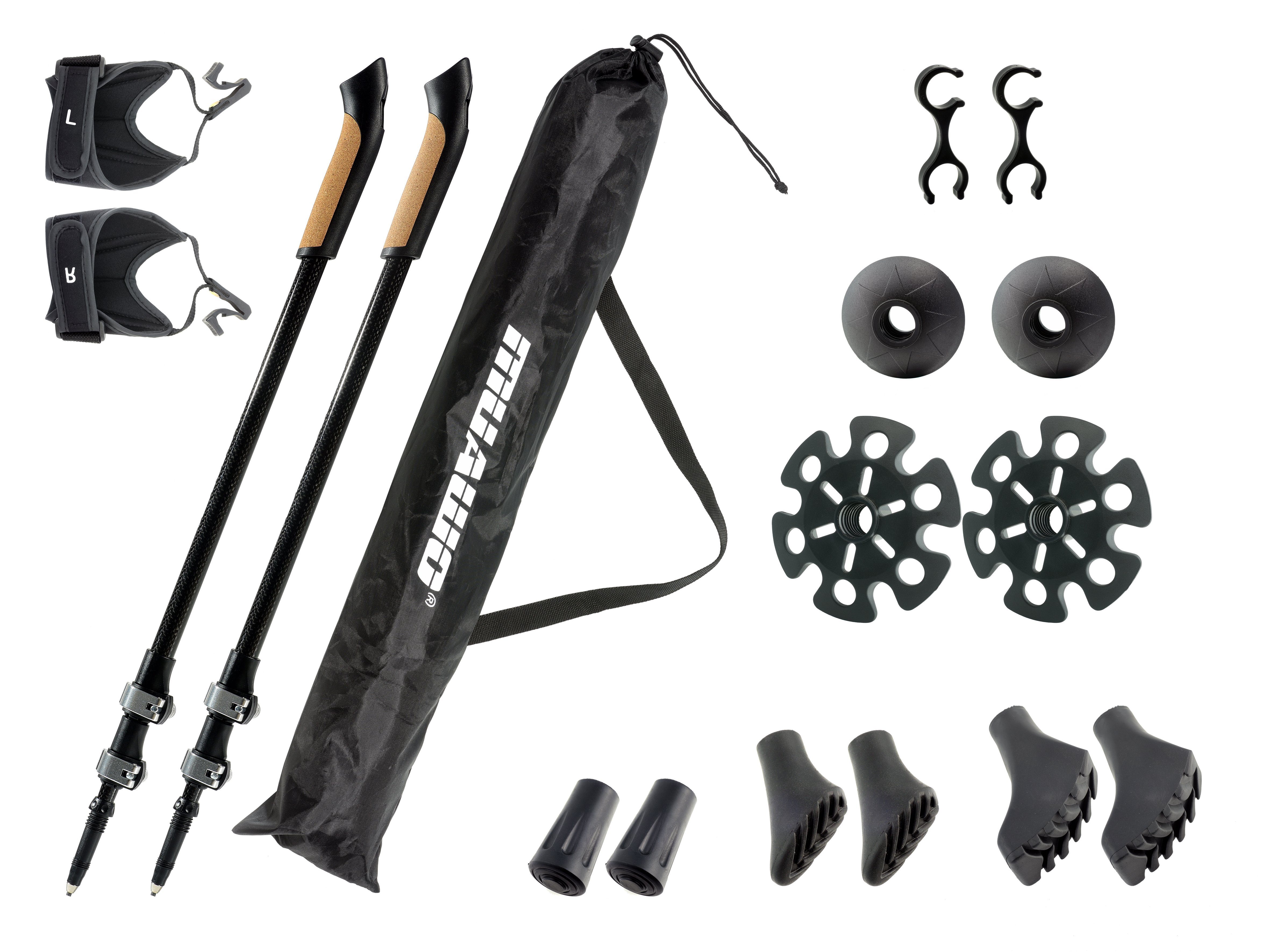 Unsere 3K Carbon Walking Stöcke kommen als komplettes All in One Set – mit allen notwendigen Teilen und Zubehör (Aufsätze, Handschlaufen & Tasche). Kein lästiges Nachkaufen oder Suchen zusätzlicher Komponenten. Sofort einsatzbereit, sorgt das Rundum Paket für echten Mehrwert auf jeder Wanderung.