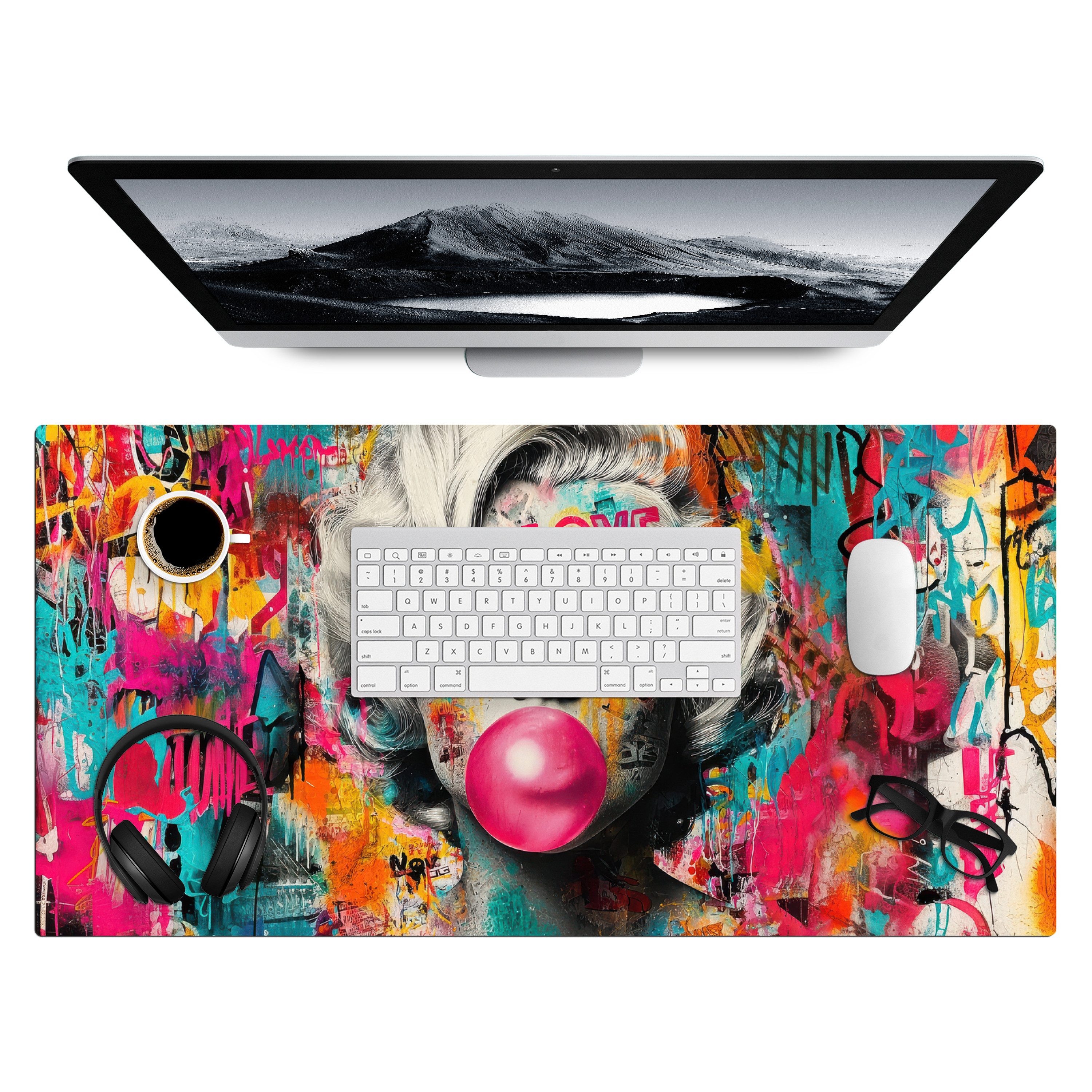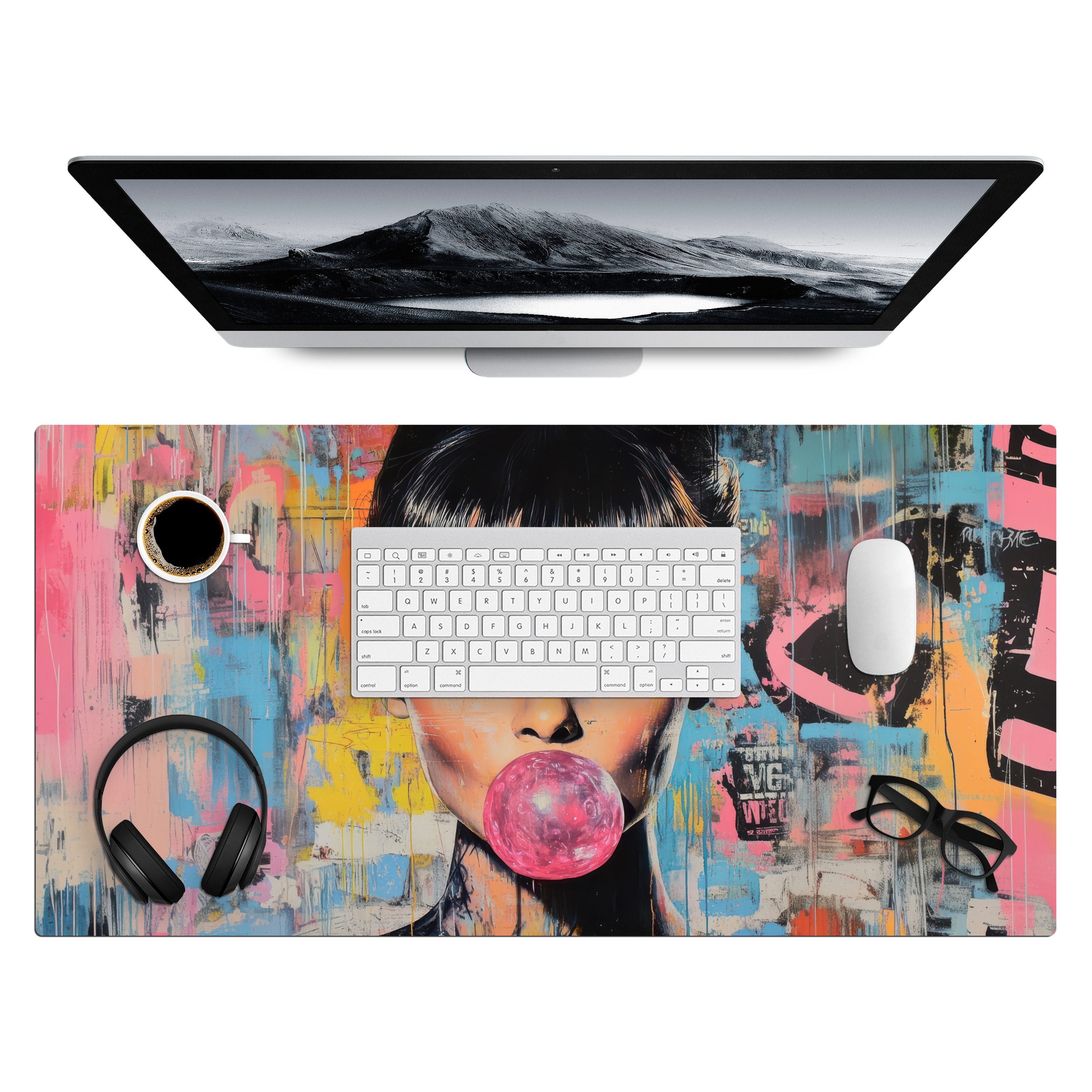 Eine Frau mit dunklen Fransen bläst eine rosafarbene Kaugummiblase und schaut dabei direkt in die Kamera. Der Hintergrund ist eine Explosion von groben Pinselstrichen und Graffiti in Pastell- und hellen Farbtönen, die die klassische Pose modern machen.