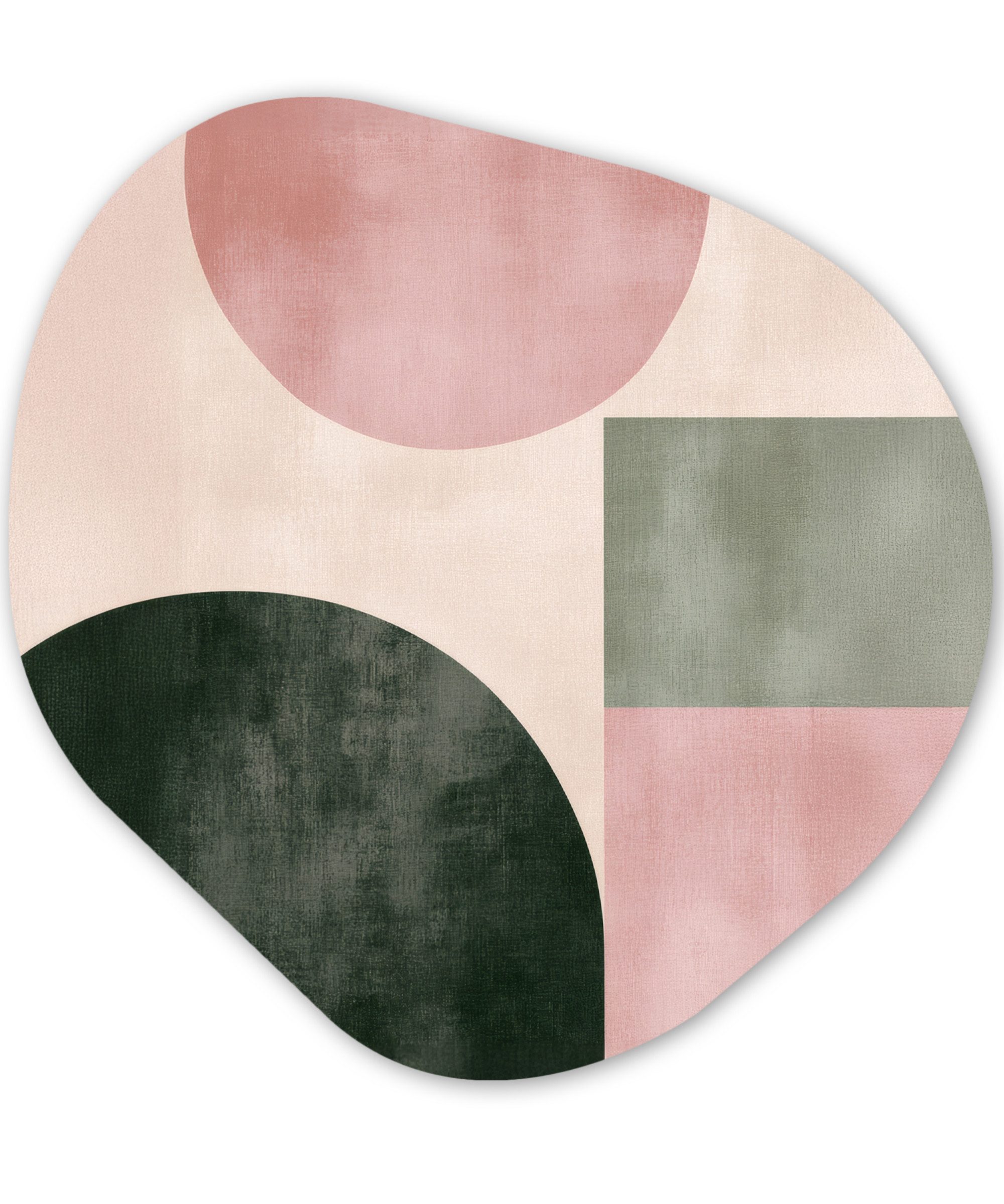 Schlanke geometrische Formen in sanften Rosa- und Grüntönen füllen das Bild. Kreis, Quadrat und Rechteck stehen im Vordergrund.| Kunstgenre | Modern, Natur, Tiere, Abstrakt, Kinderzimmer |