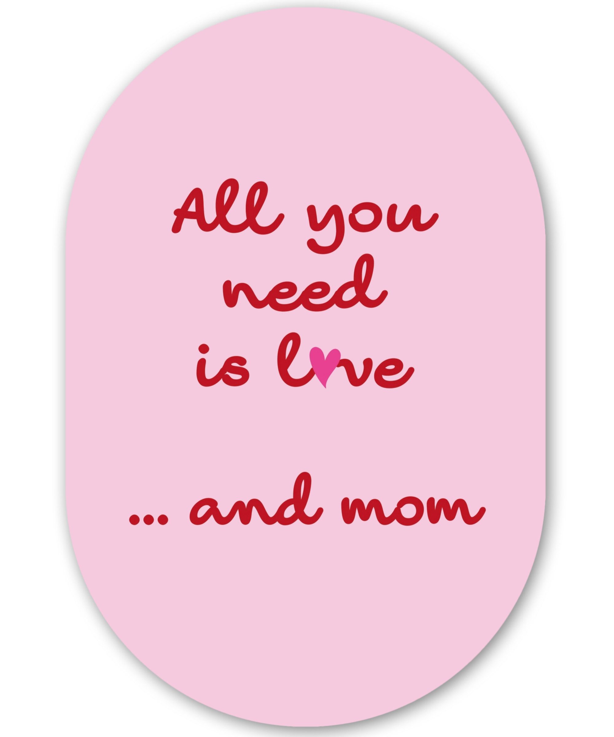 Ein beiger Hintergrund mit handgeschriebenen blauen und roten Buchstaben, die den Text "All I need is Mom" bilden. Das "o" in "Mom" wurde durch ein rotes Herz ersetzt, das der liebevollen Botschaft Kraft verleiht.| Kunstgenre | Modern, Natur, Tiere, Abstrakt, Kinderzimmer |