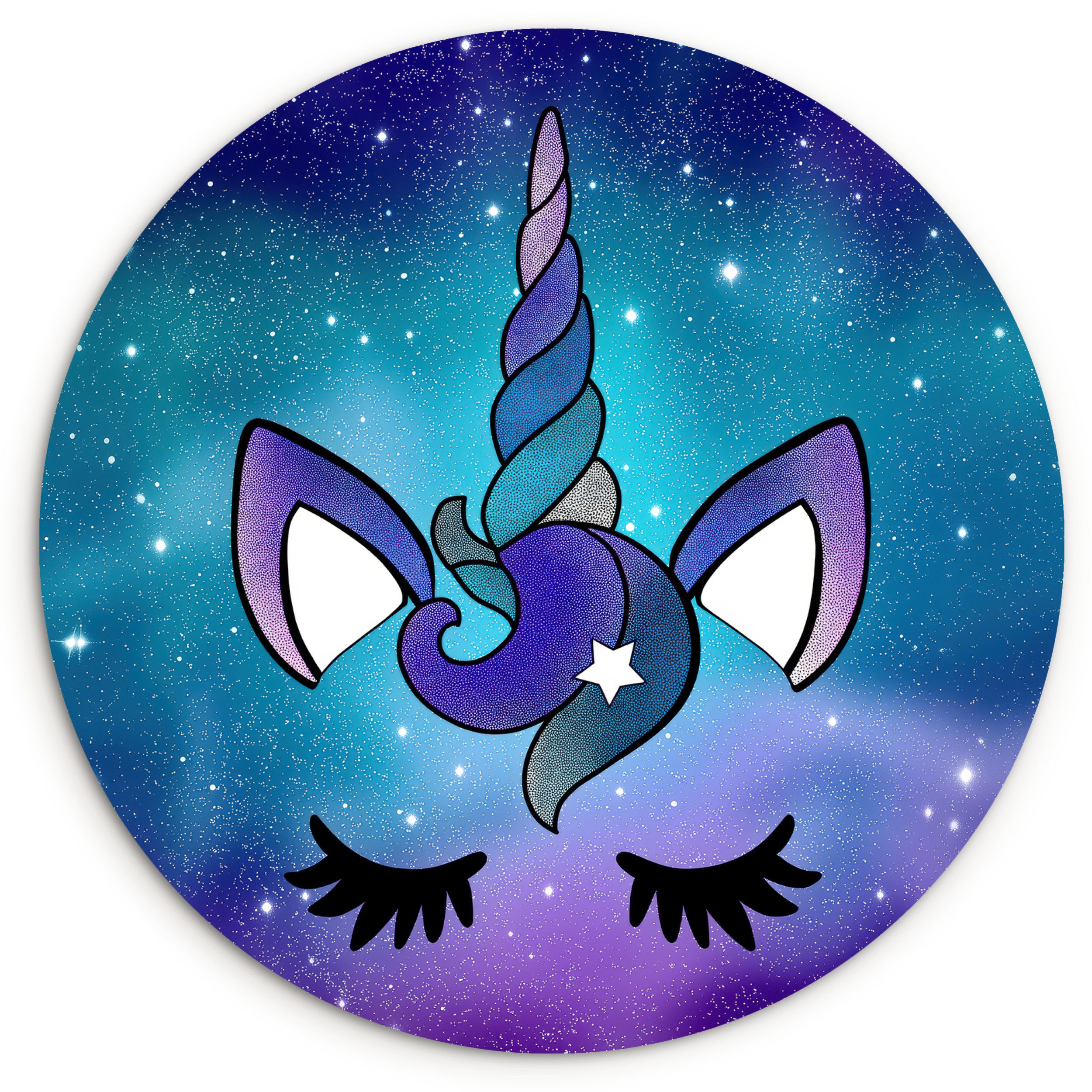 Stilvolles Einhorn mit geschlossenen Augen und einem dunklen, schimmernden Horn. Die Mähne ist blau-violett mit einem sanften Farbverlauf. Der Hintergrund zeigt eine Galaxie in Lila-, Blau- und Schwarztönen und schafft eine magische Atmosphäre.