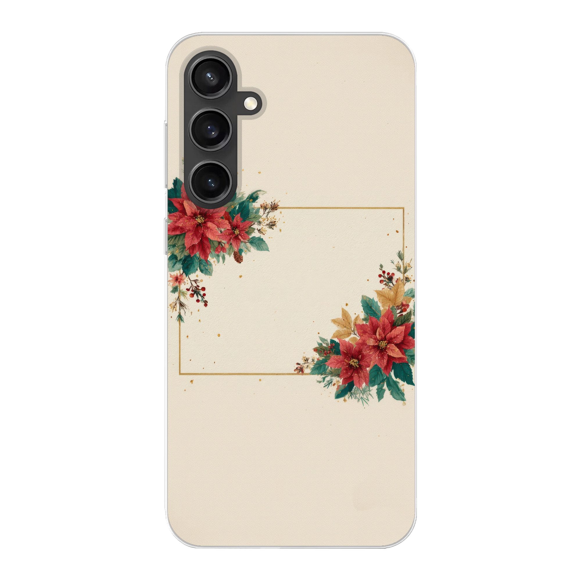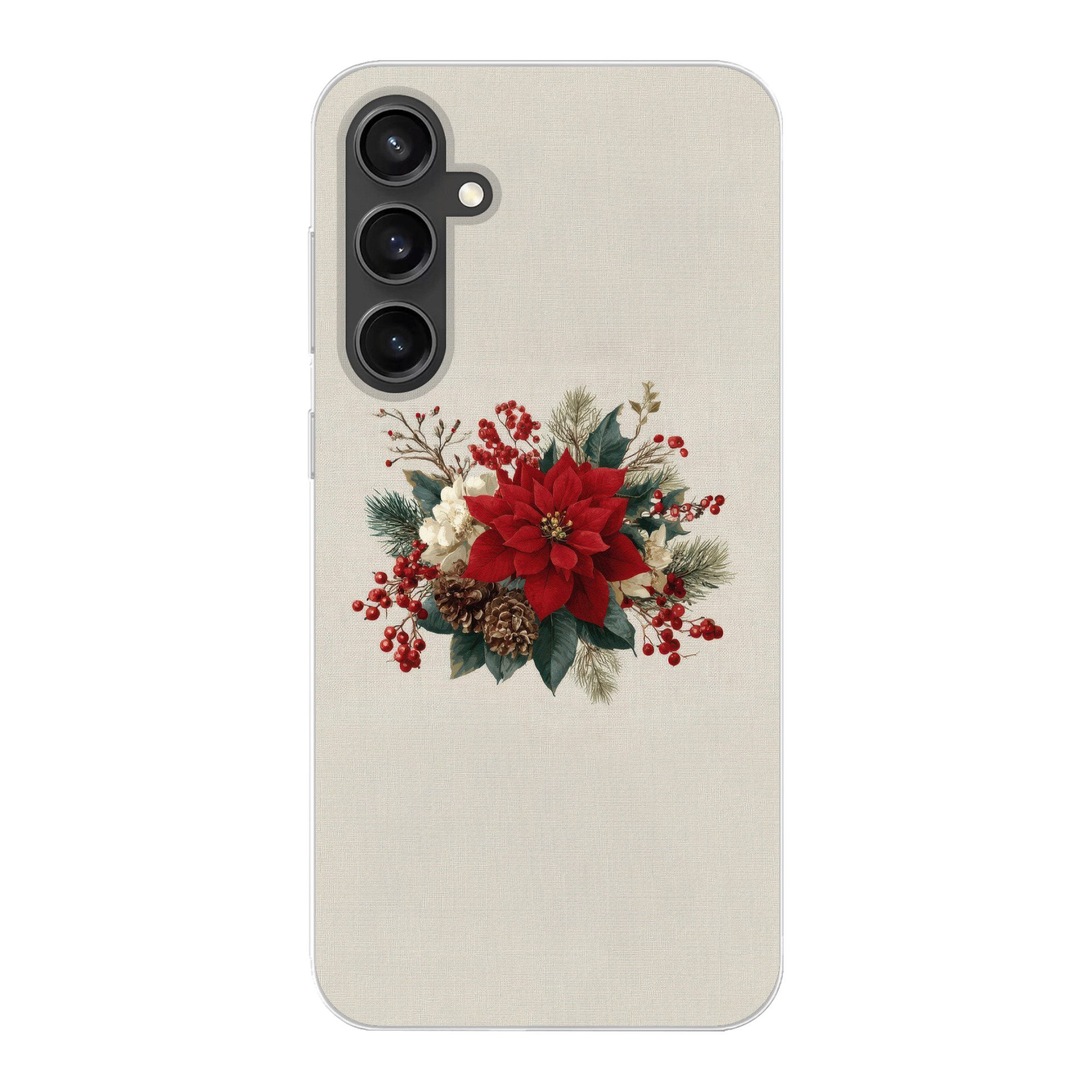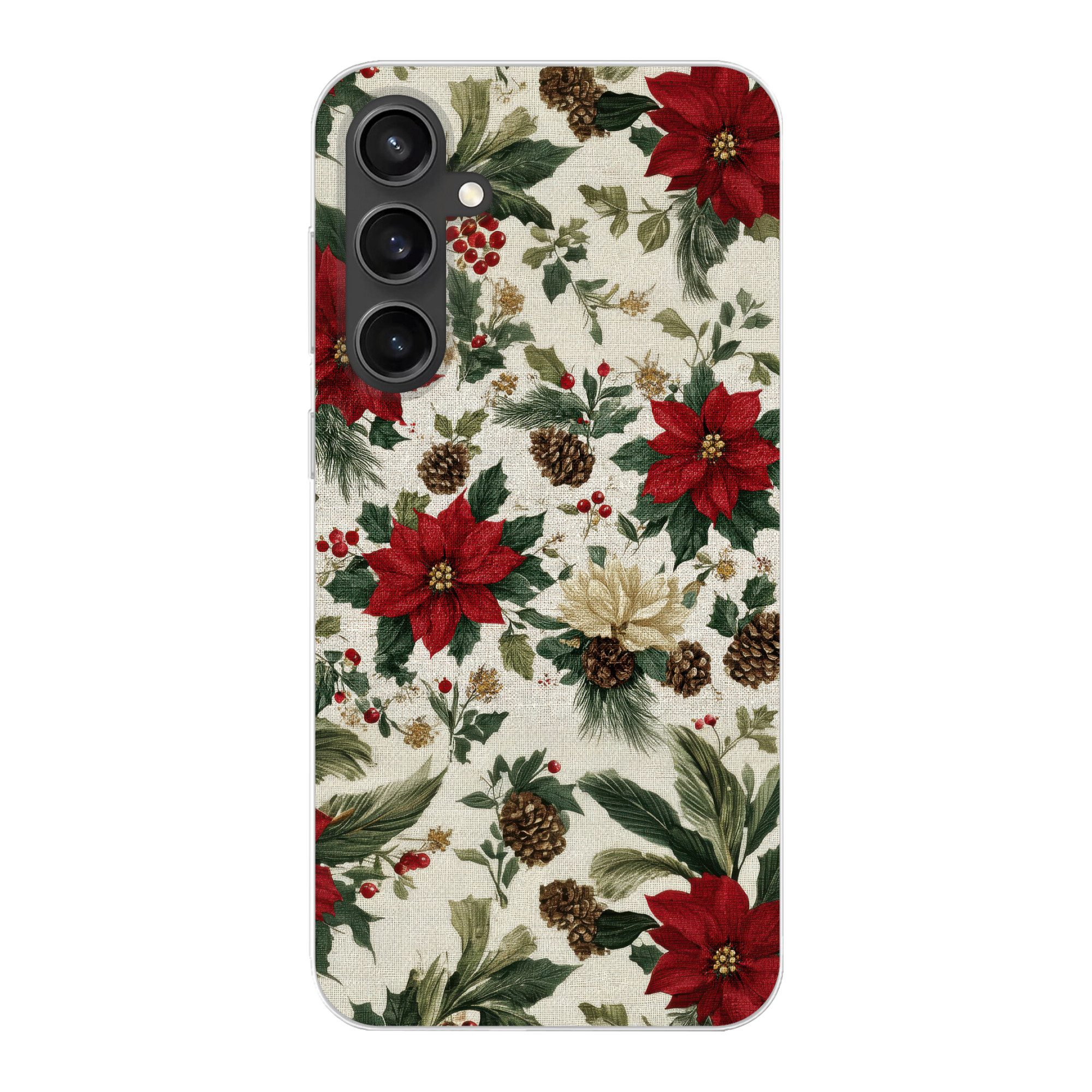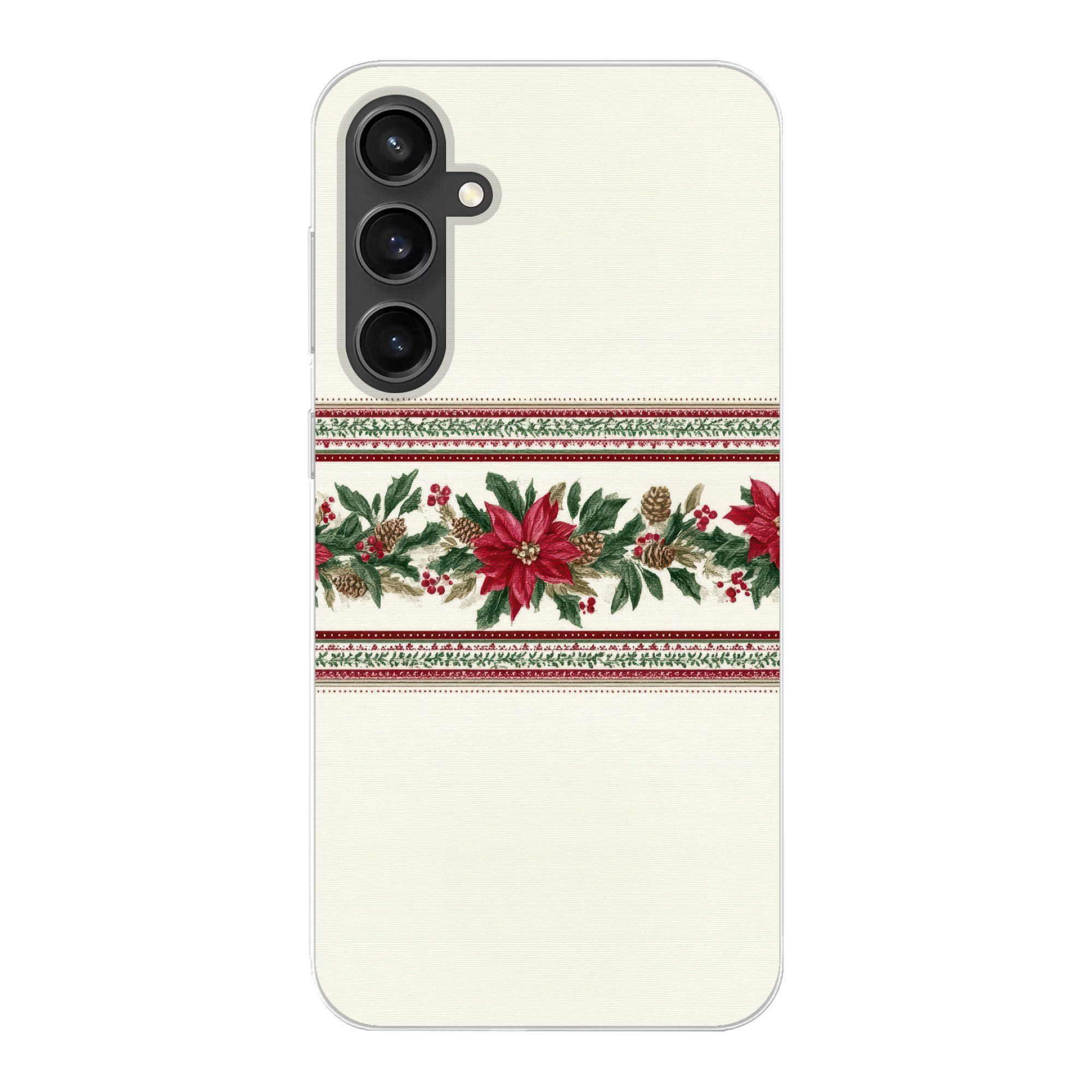 Eine horizontale Bordüre mit roten Weihnachtssternen, Tannenzweigen, Tannenzapfen und roten Beeren ziert einen hellen Hintergrund. Die florale Dekoration wird von zarten Streifen mit Stechpalmenmotiven in Rot und Grün eingerahmt. Das Design erinnert an ein festliches Tischtuch oder eine Weihnachtsserviette.