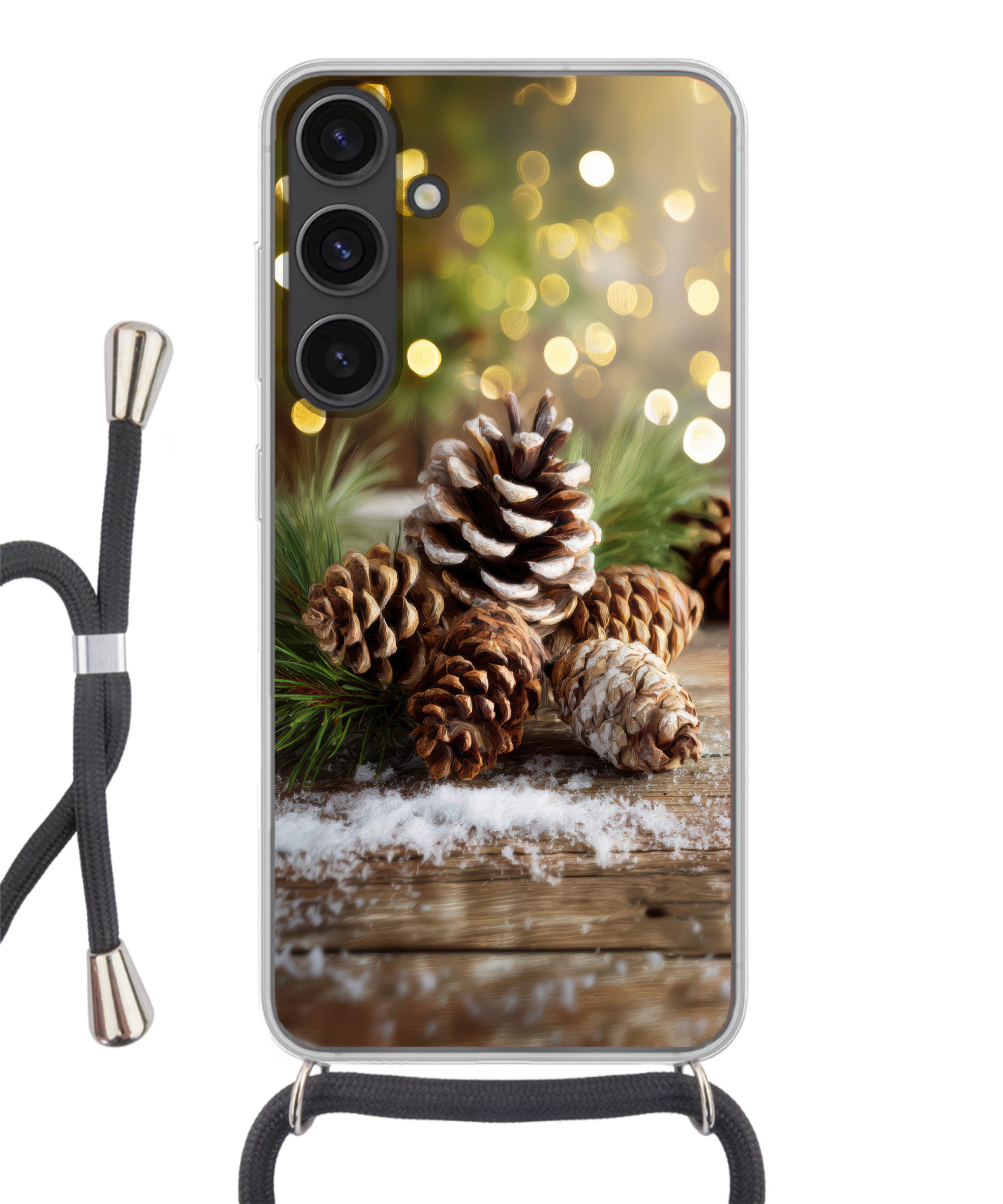 Eine Sammlung von Tannenzapfen liegt auf einer Holzfläche, umgeben von Tannenzweigen und leichtem Schnee. Einige Zapfen sind an den Rändern weiß, was einen gefrorenen Effekt ergibt. Der Hintergrund ist mit warmen Glühbirnen sanft unscharf und verleiht der Szene eine rustikale Weihnachtsatmosphäre.