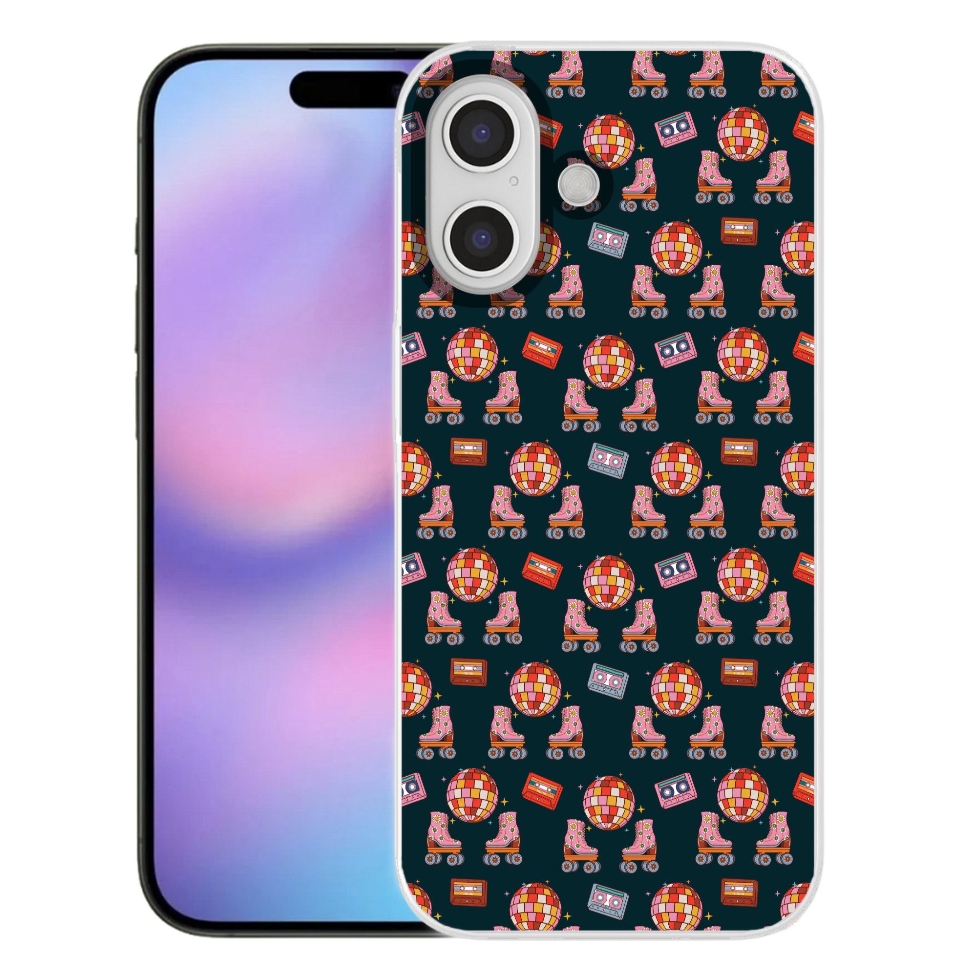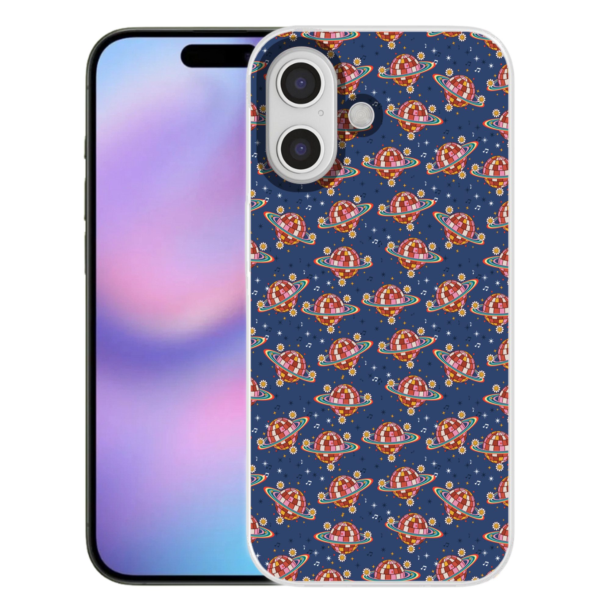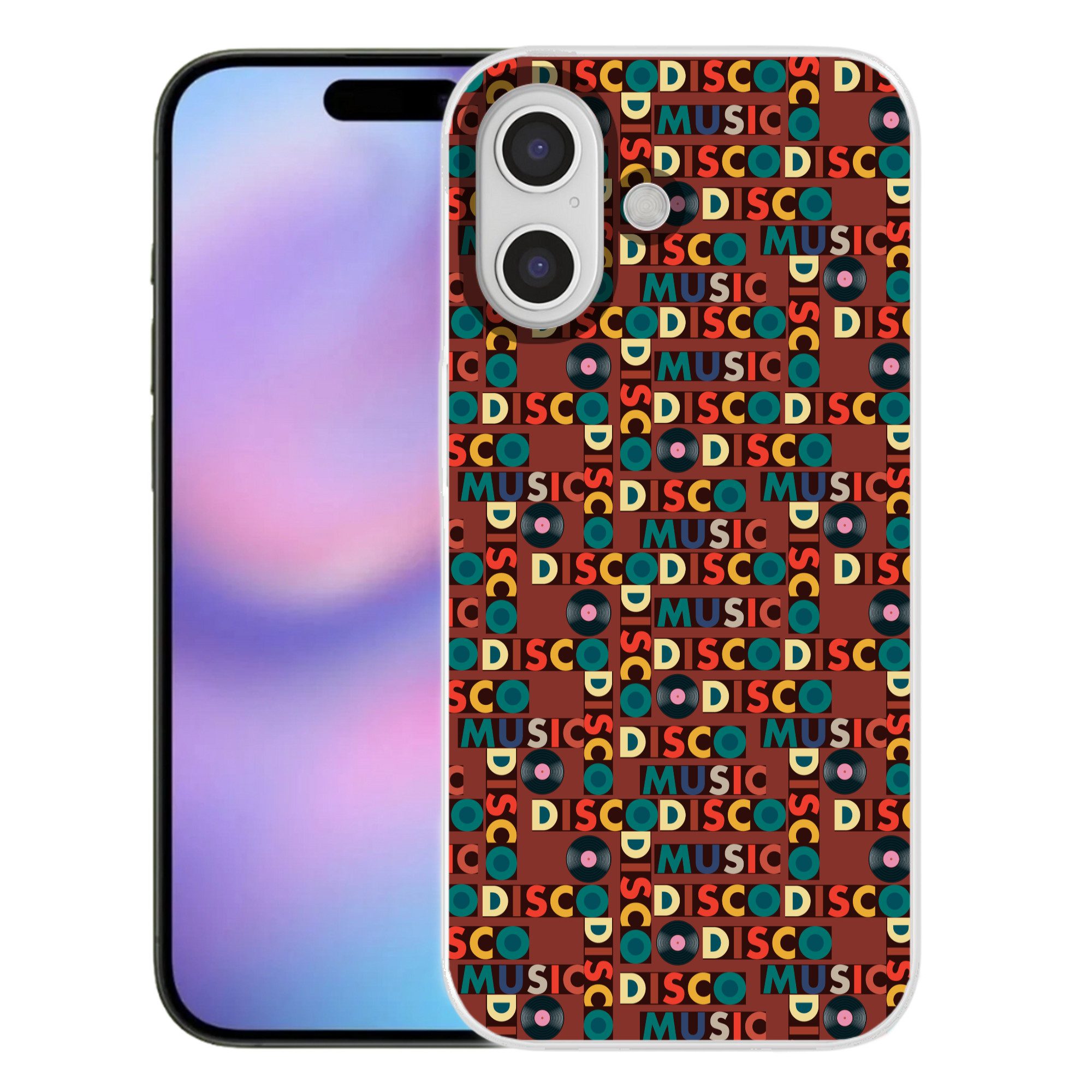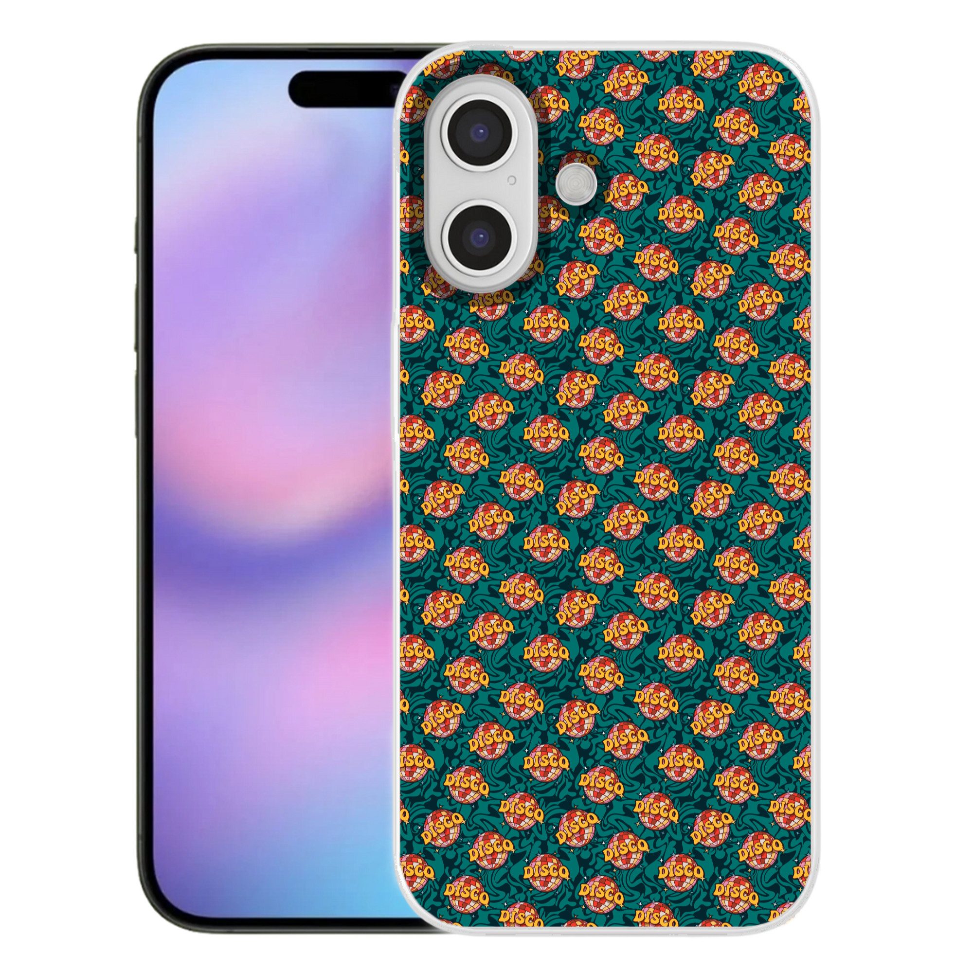 Illustratives Muster mit roten Discokugeln und dem Wort "DISCO" in orangefarbenen Buchstaben, die sich auf einem gewellten, abstrakten grünen Hintergrund wiederholen. Sternförmige Akzente verstärken das lebhafte Retro-Gefühl dieses Musters.