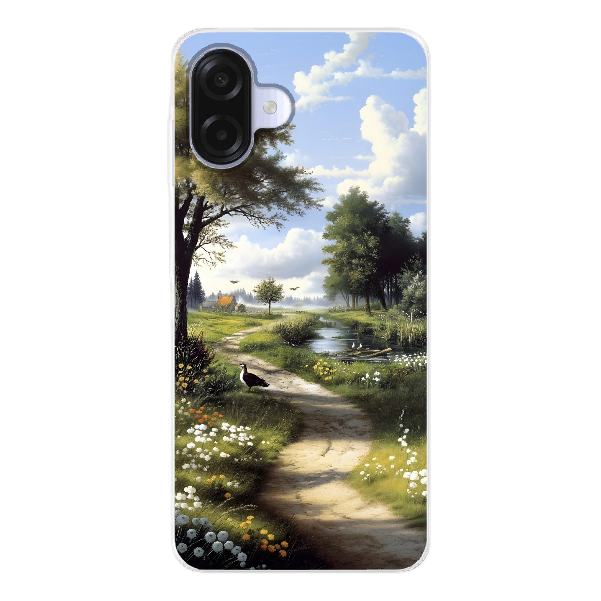 Ein Feldweg schlängelt sich durch eine grüne Landschaft mit Bäumen, Blumen, Bächen und Vögeln. In der Ferne sind Hütten unter einem leicht bewölkten Himmel zu sehen. Die Natur sieht frisch und einladend aus.