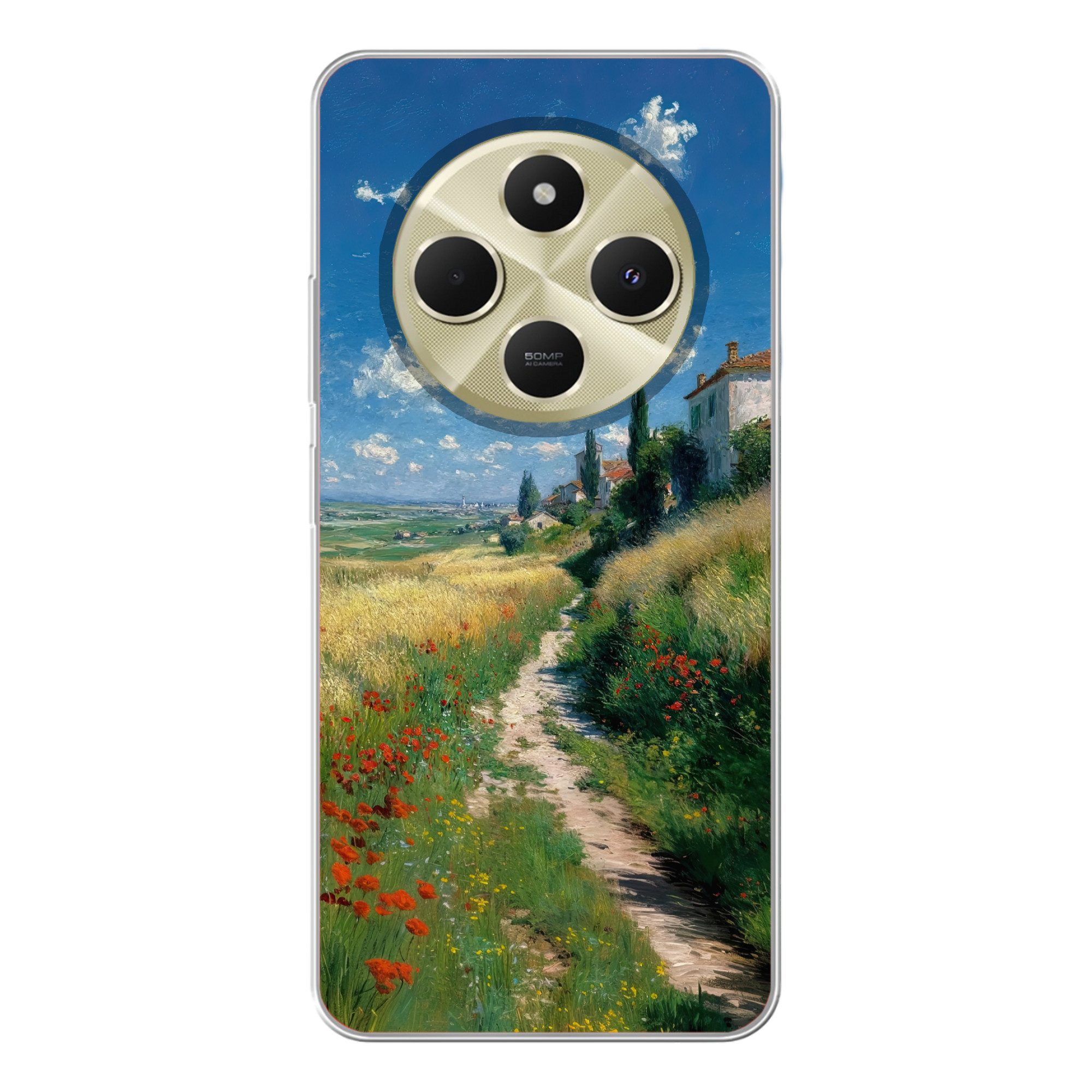 Die Sandpiste schlängelt sich zwischen gelben Getreidefeldern, Wildblumen und Zypressen in Richtung Häuser unter einem klaren blauen Himmel.