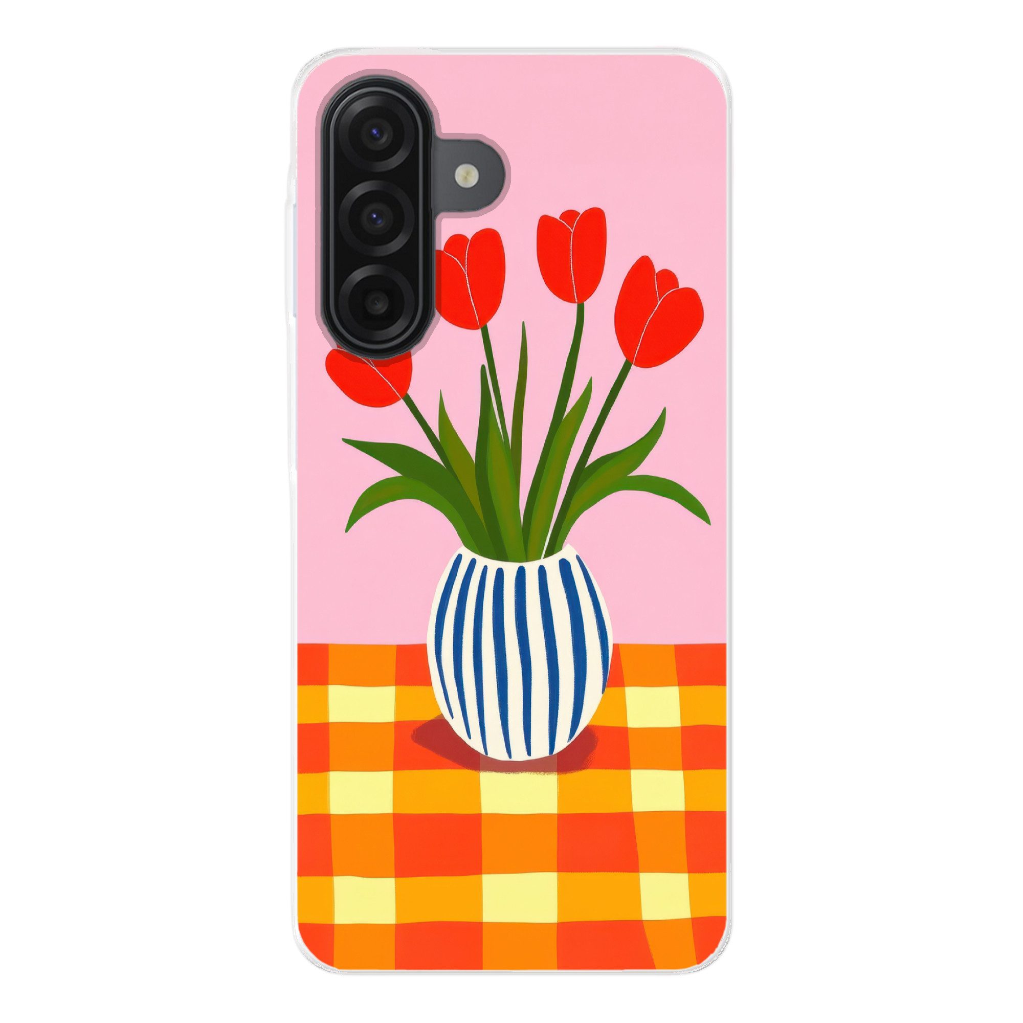 Vier rote Tulpen stehen in einer weiß-blauen Vase mit vertikalen Streifen. Die Vase steht auf einem Tisch mit rot-gelb karierter Tischdecke vor einem rosa Hintergrund.