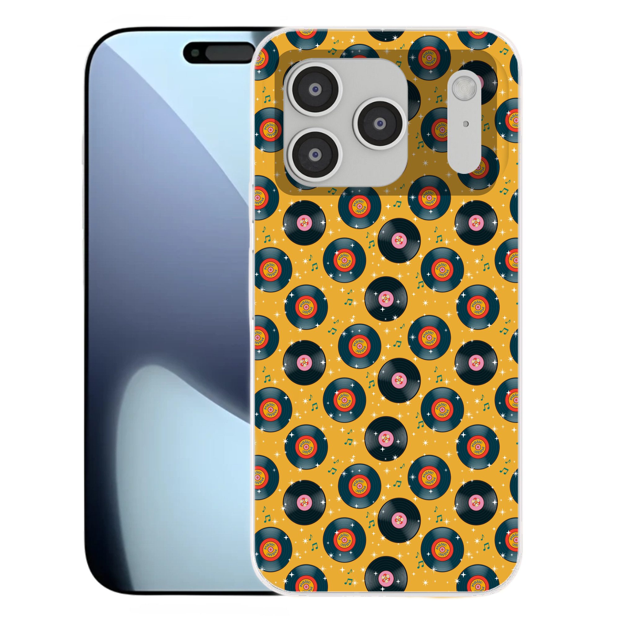 Illustratives Muster aus schwarzen Schallplatten mit bunten Etiketten und floralen Motiven auf ockergelbem Hintergrund verstreut. Musiknoten und weiße Sterne sorgen für ein verspieltes Retro-Gefühl mit 70er-Jahre-Disco-Vibes.