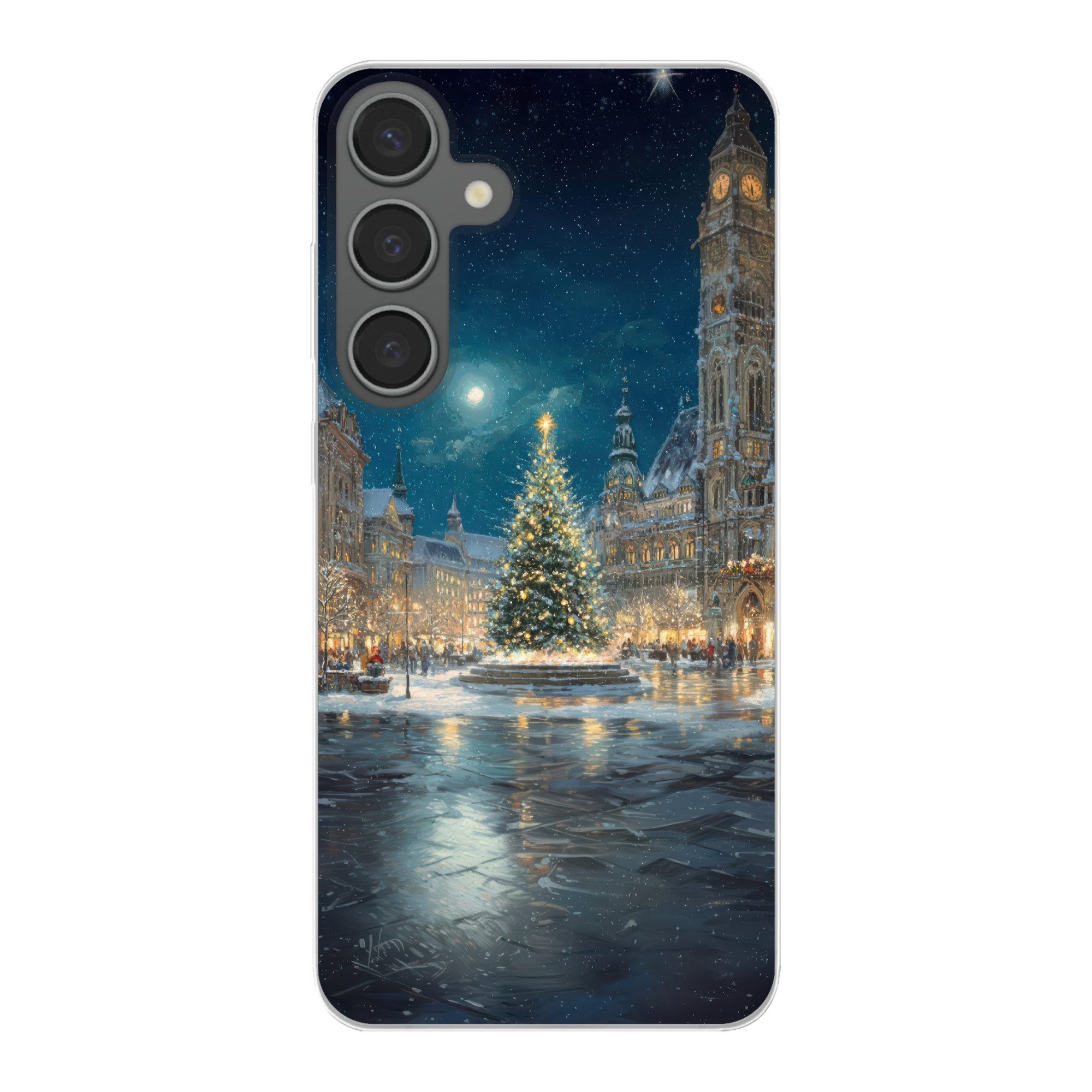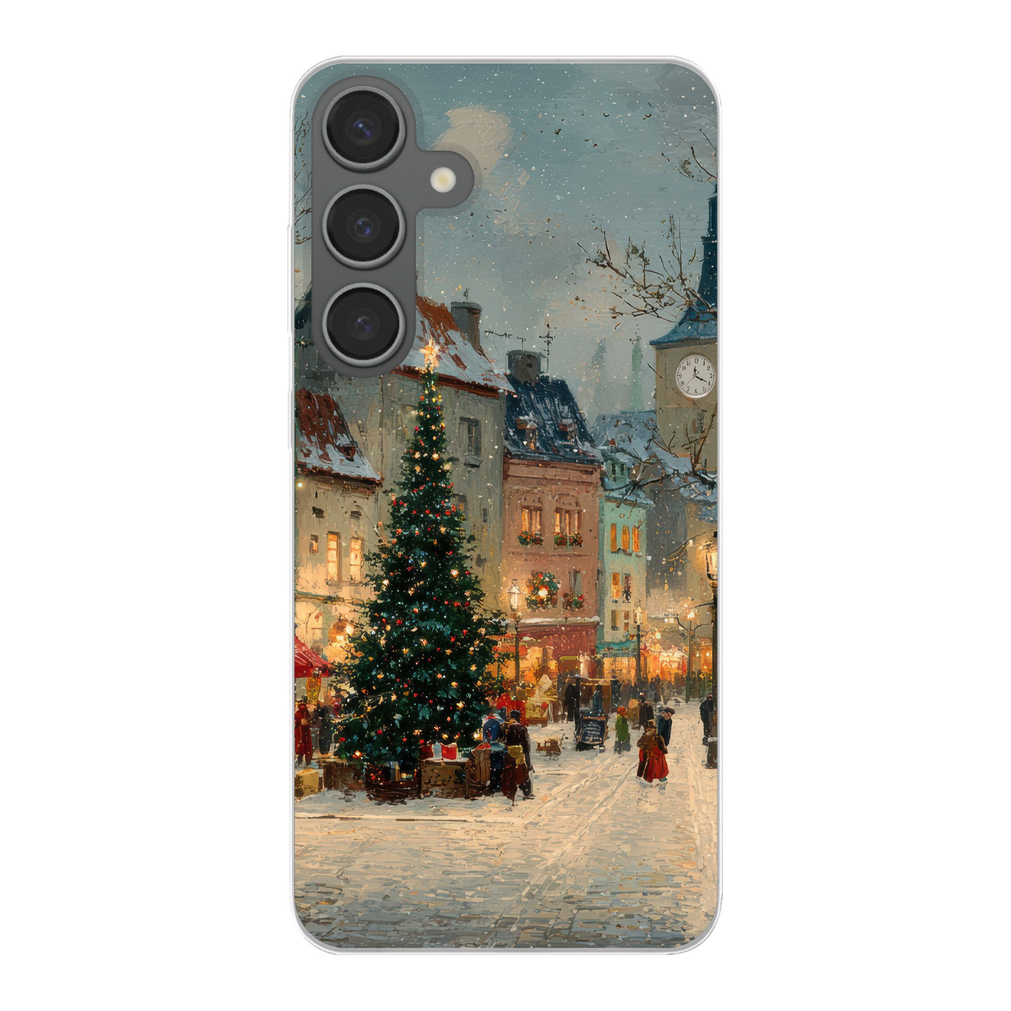 Auf dem beleuchteten Stadtplatz herrscht reges Treiben und die Menschen schlendern an den Ständen vorbei. In der Mitte steht ein großer Weihnachtsbaum voller Lichter und Dekorationen. Die umliegenden farbenfrohen Gebäude und schneebedeckten Straßen schaffen eine warme, festliche Atmosphäre unter dem sanft fallenden Schnee.