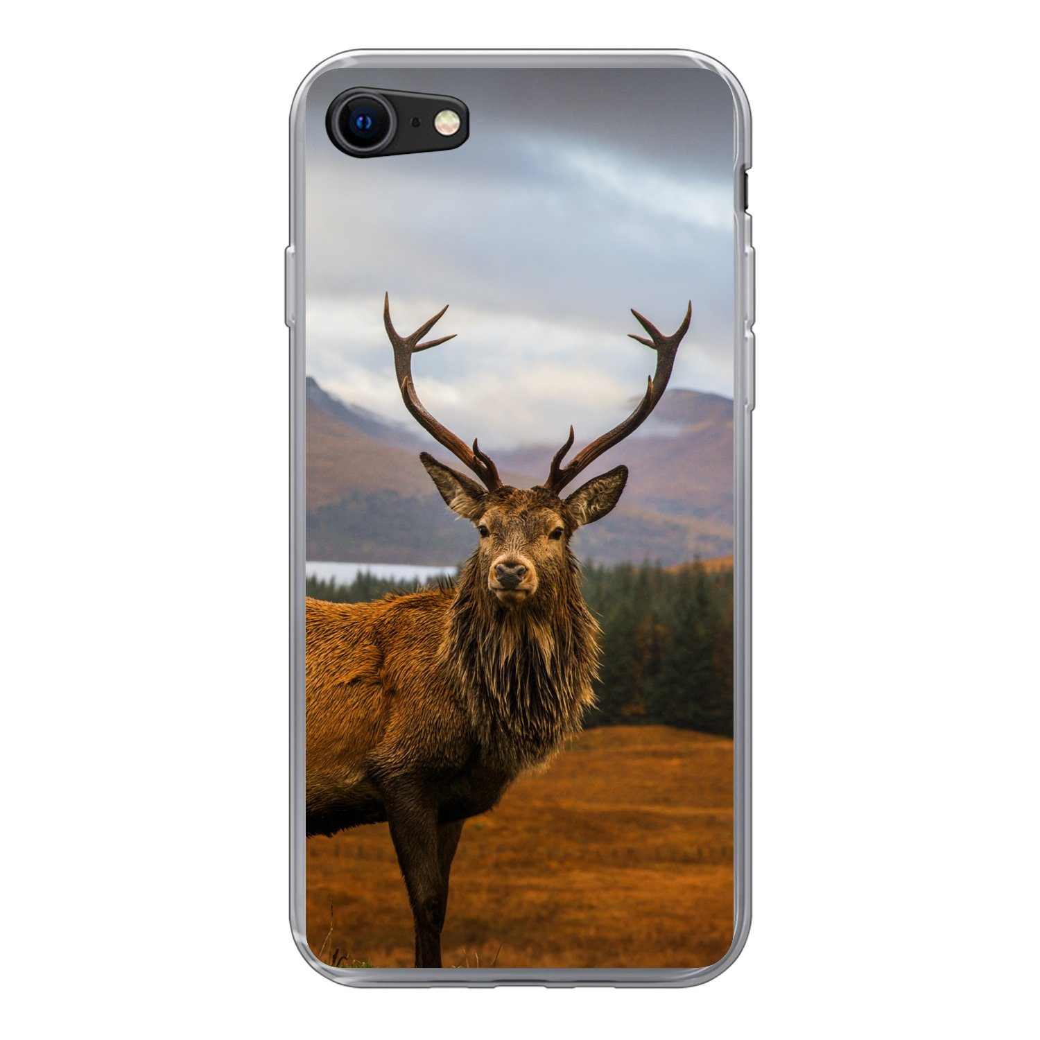 Ein atemberaubendes Rendering eines Rehs, das in der Nähe eines Sees steht. Hinter dem See sind hohe Hügel zu sehen. Das Rendering zeigt schöne Herbsttöne.| Kompatible Geräte | Apple iPhone 8 |