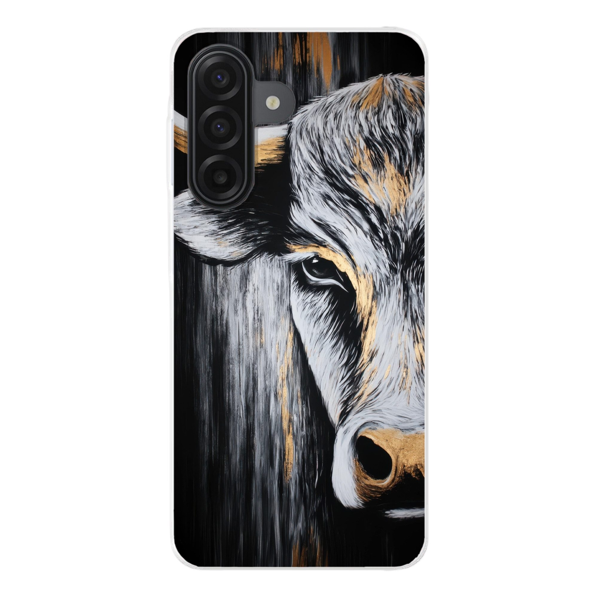 Ein Stier blickt geradeaus, mit intensiven Augen und detaillierter Gesichtsstruktur. Goldfarbene Akzente heben die Hörner und die Schnauze hervor und kontrastieren mit dem dunklen Hintergrund.